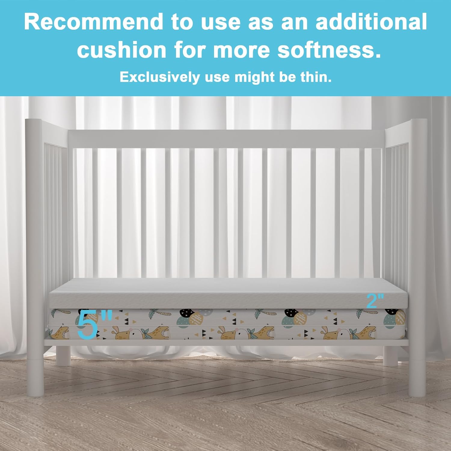Our 2" crib mattress topper is crafted to enhance your babyâs sleep experience, offering a perfect balance of softness and support. Designed for use with standard 27.5" x 52" cribs, this topper ensures a safe and comfortable place for your little one to rest. The waterproof TPU back cover protects against spills and leaks, keeping the mattress clean and hygienic. With a detachable and machine washable design, maintenance has never been easier.