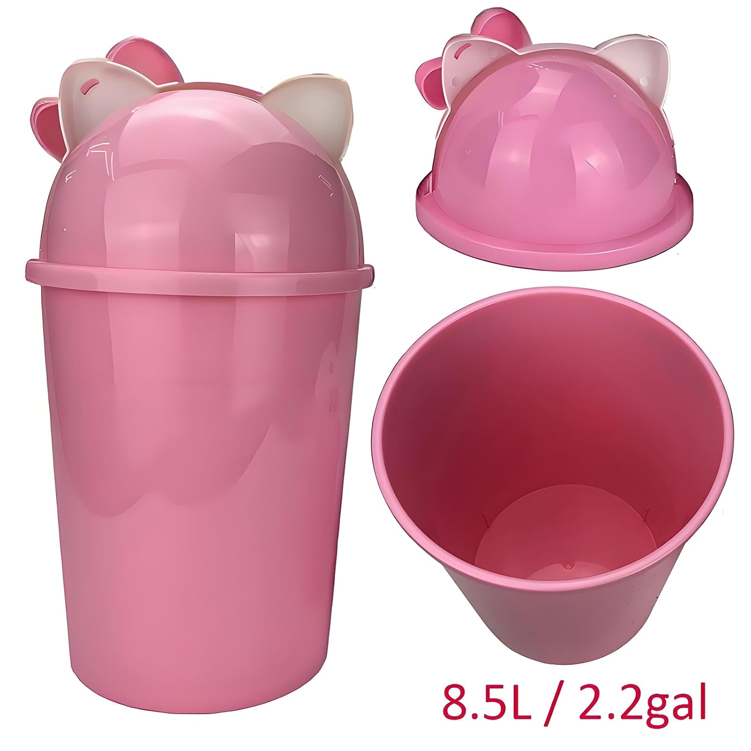 This 2-gallon cute pink kids trash can is a stylish and functional addition to any childâs space. Perfect for young girlsâ bedrooms or nurseries, it combines charm with practicality to keep the room clean and organized. The soft pastel pink color and playful design make it a standout piece of decor that your little one will love.