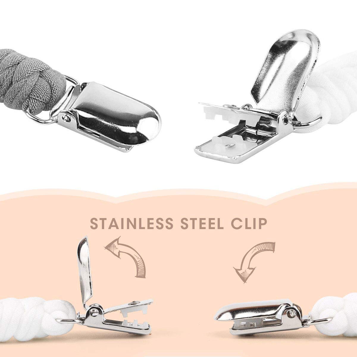 Made from high-quality, eco-conscious polyester braided rope, these clips are gentle on your babyâs skin and safe for everyday use. Paired with a durable stainless steel clip, they ensure long-term reliability and comfort.