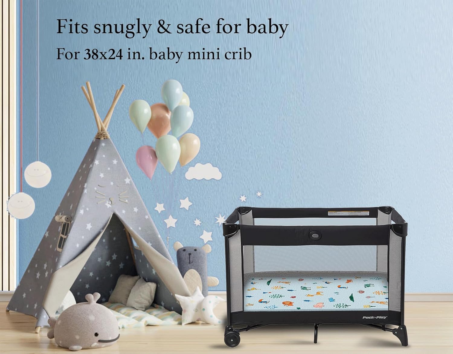 Measuring 38x24 inches, this mattress pad is the ideal solution for pack and play units, playpens, and mini cribs. Its durability and adaptability make it perfect for both on-the-go parents and those creating a cozy sleeping space at home. Whether you're traveling or setting up a safe environment at home, this product offers reliable comfort and support for your baby, no matter the situation.