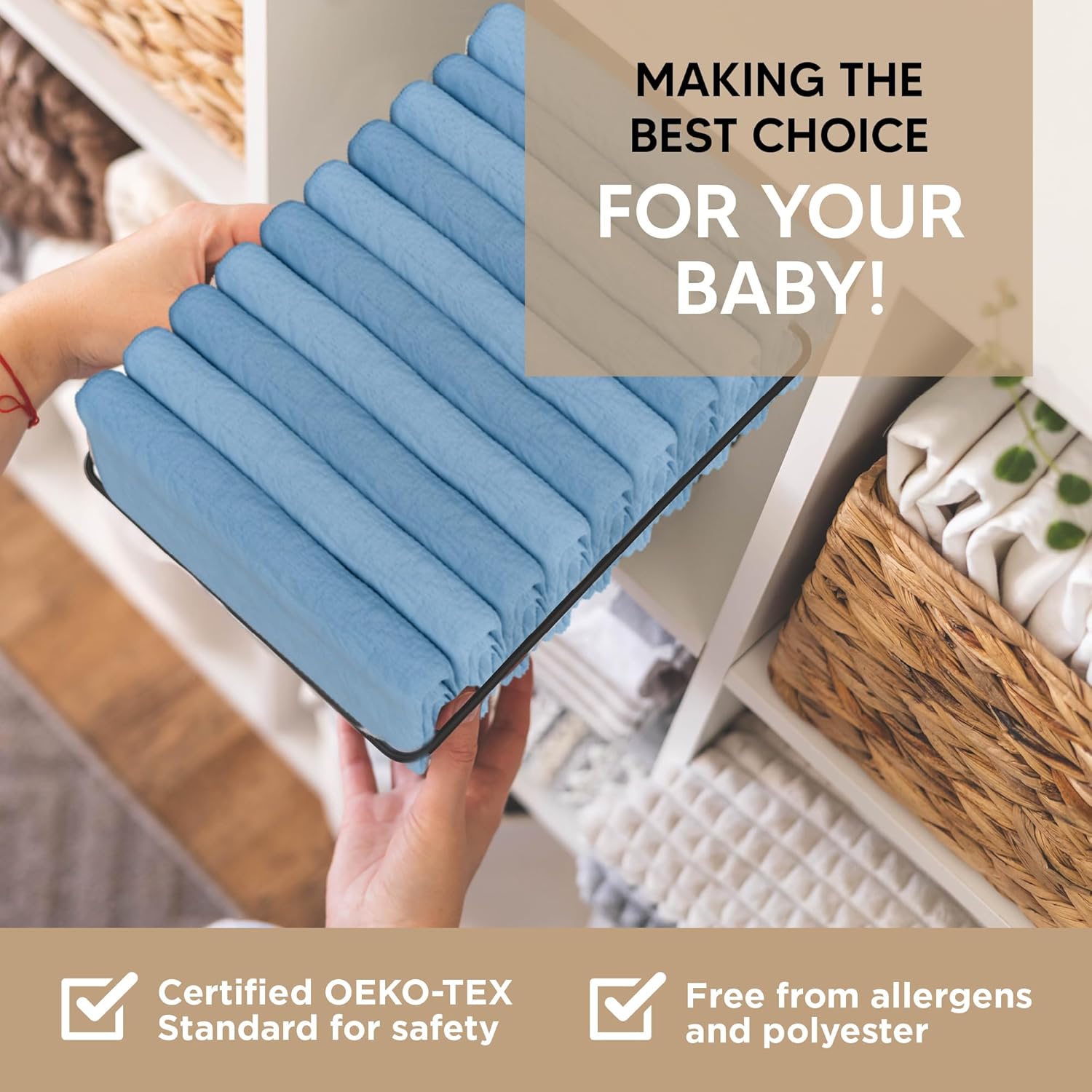 Machine washable and durable, they are built for long-lasting use without losing their softness or shape. The classic light blue design adds a touch of elegance and calm to your babyâs room, creating a soothing atmosphere for peaceful sleep. With a 2-pack option, you'll always have extra sheets ready for spills, laundry, or seasonal changes.