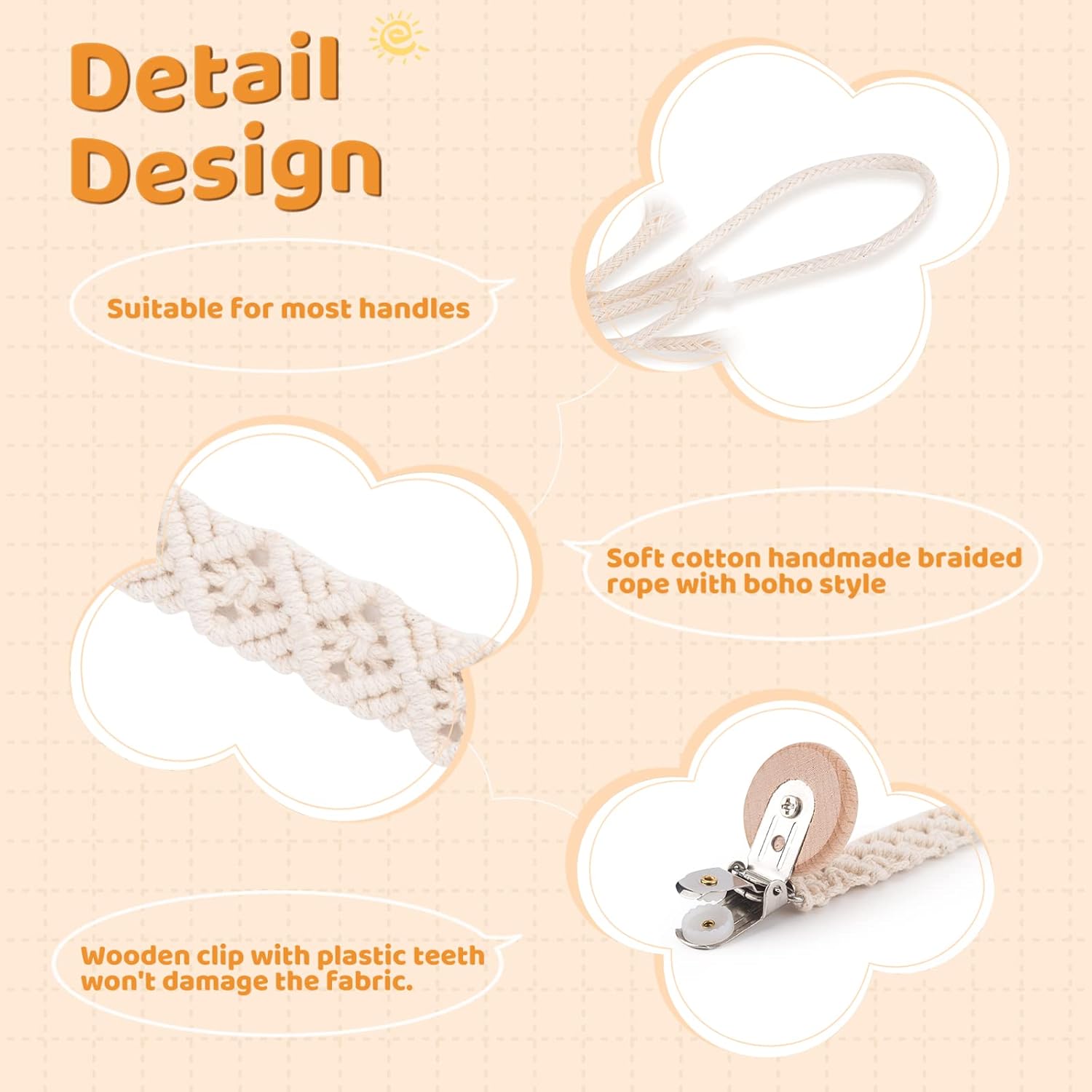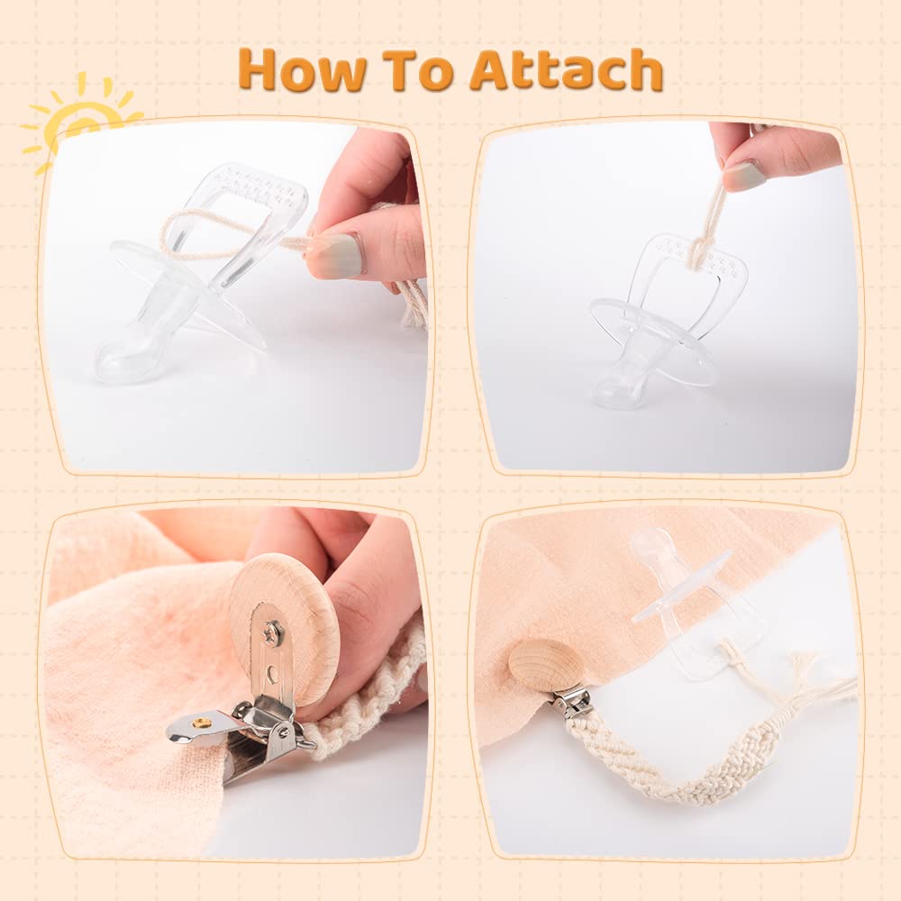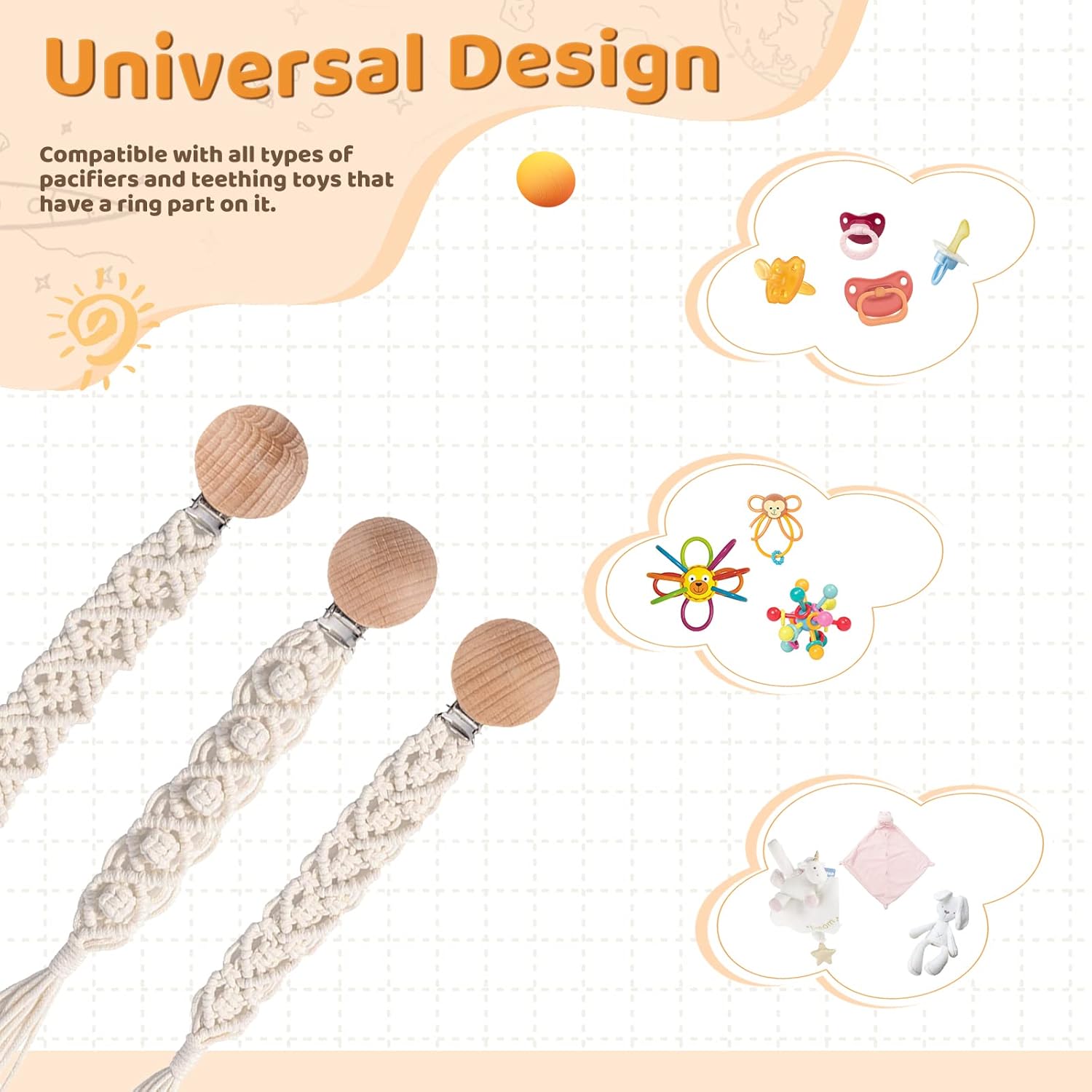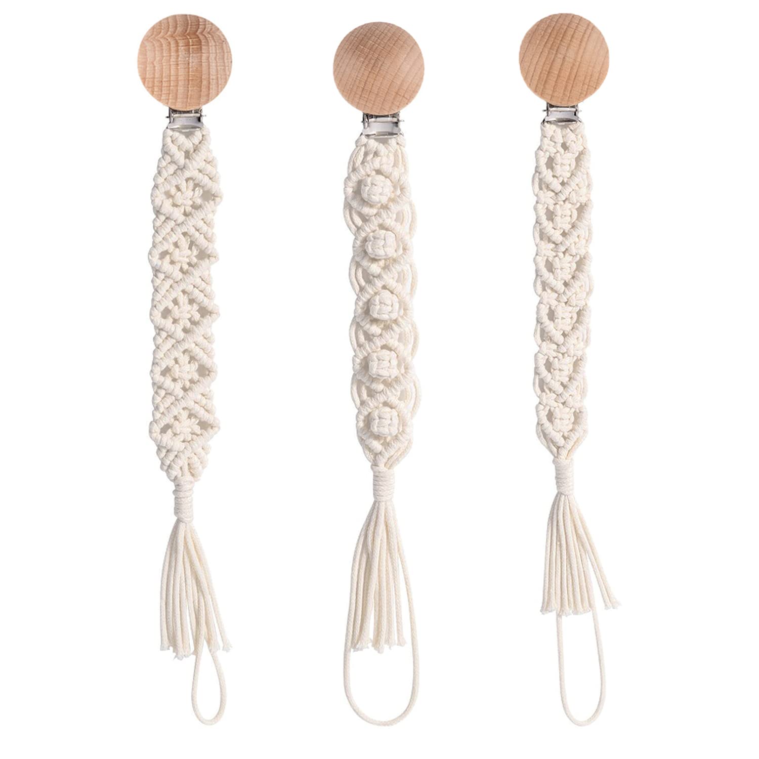Add a touch of bohemian charm to your babyâs routine with our handcrafted pacifier clip holder. Designed with a beautiful wooden clip and braided cotton, itâs both functional and stylish, ensuring your little one stays comforted while keeping the pacifier clean and close at all times.