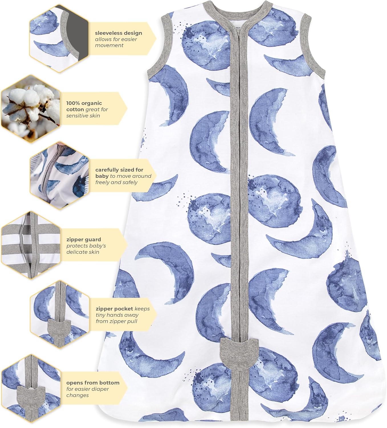 This adorable wearable blanket is designed with your baby's comfort and safety in mind. Made from 100% organic cotton, it offers a soft, hypoallergenic feel that's gentle on delicate baby skin, making it the perfect addition to any babyâs nursery or sleep space.
