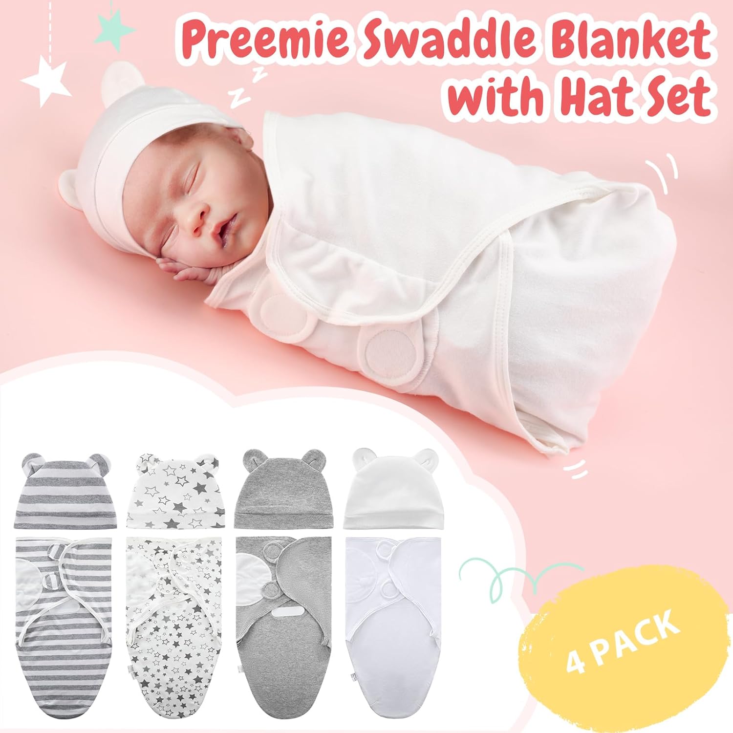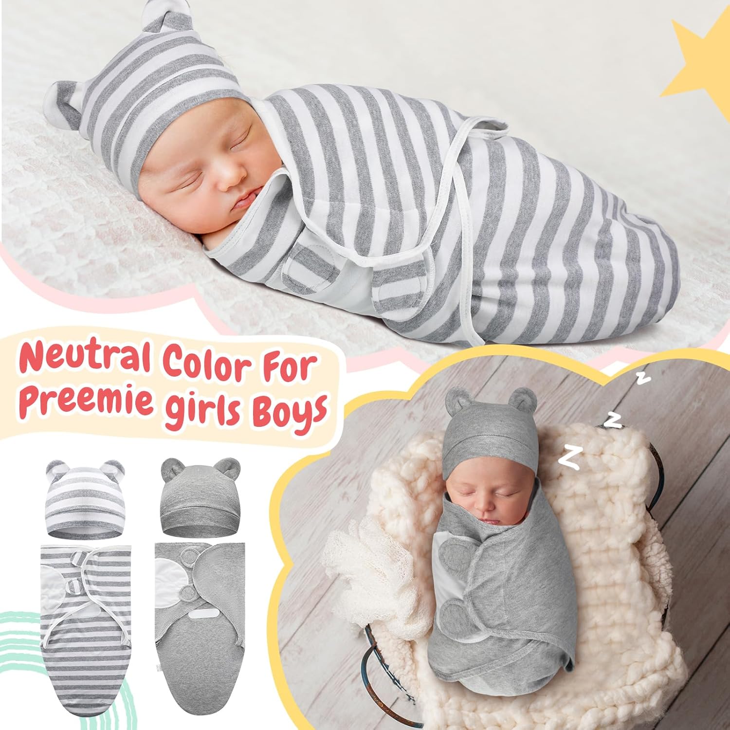 Whether you're swaddling, feeding, or burping your baby, this set is a handy addition to your baby care routine. The combination of soft, adjustable swaddles and fashionable hats ensures your baby feels safe, comfortable, and stylish while also providing you with a reliable tool to help them sleep better and longer. A great gift for new parents and a must-have for every preemie care kit.