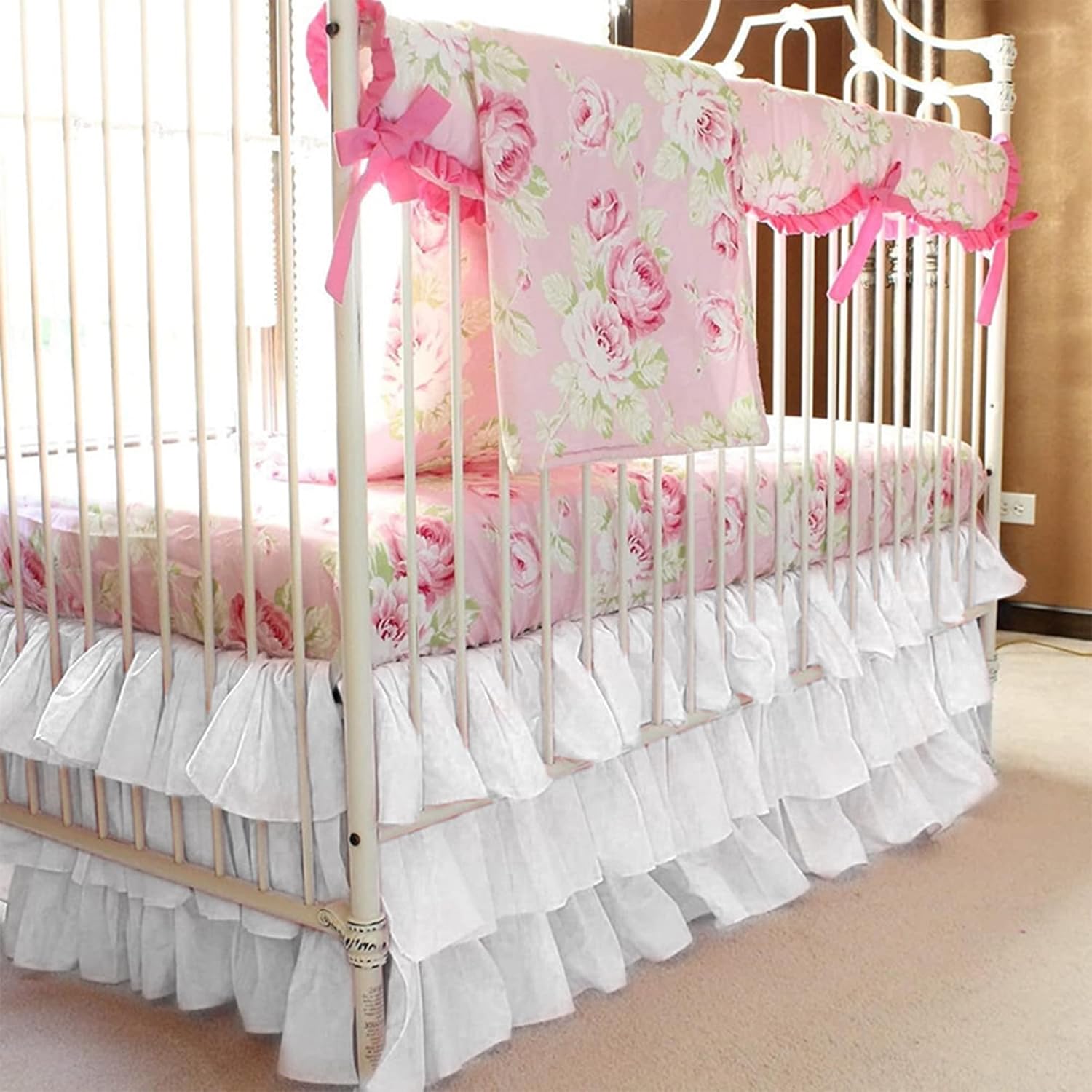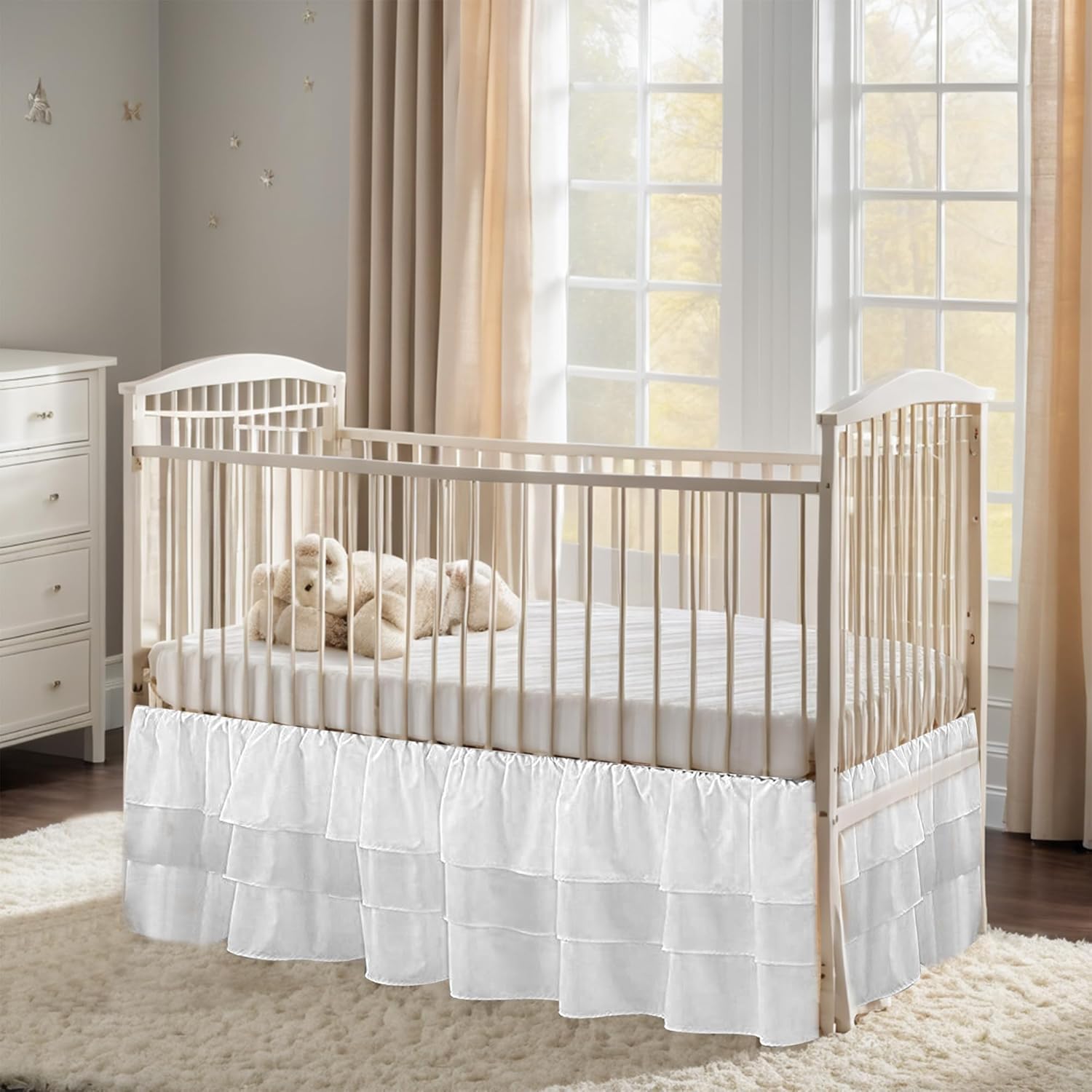 Elevate your baby's nursery with this beautifully designed crib skirt. Combining soft and breathable premium cotton with a 3-tier ruffled pattern, it adds a touch of elegance and charm to your little one's sleeping area. The 17.7" drop is thoughtfully crafted to cover under-crib storage spaces, giving your nursery a more refined and organized appearance. Made from durable woven material, it's easy to maintain and features a solid white color that effortlessly blends with any nursery decor, making it a perfect choice for parents who want both style and functionality.
