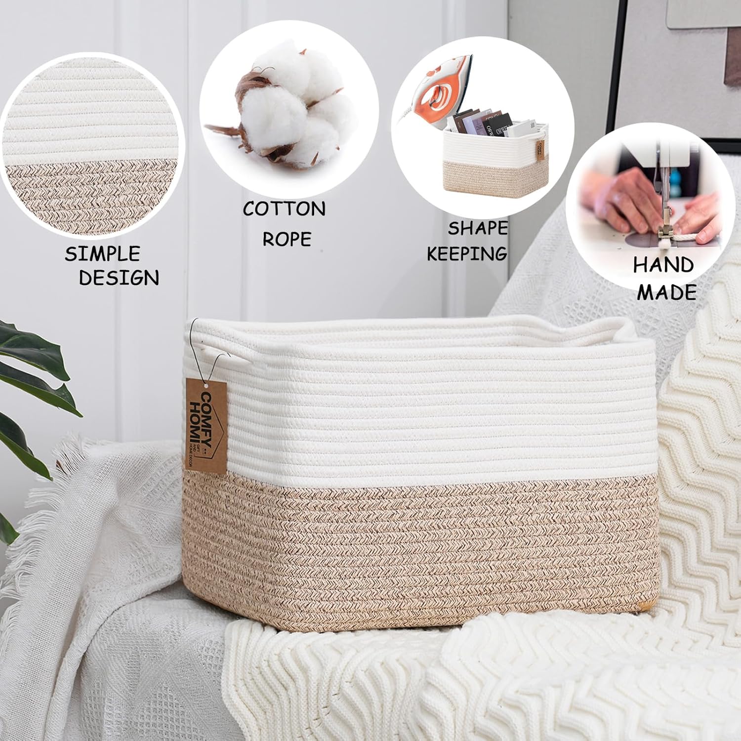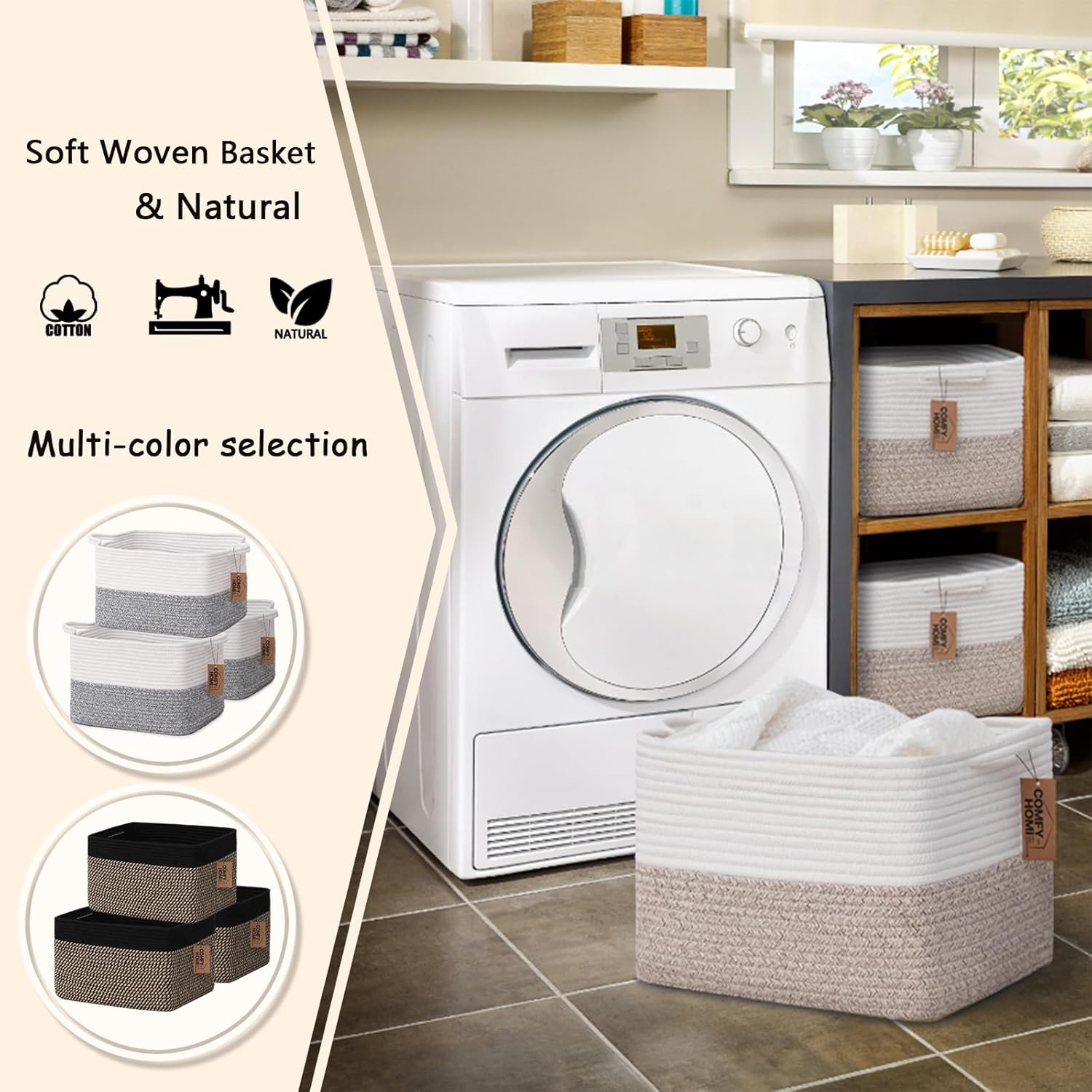 COMFY-HOMI delivers 3-pack cotton rope woven baskets with handles in natural white and brown colors. Ideal for storing books, toys, and clothes, these baskets are perfect for living rooms, nurseries, and bathrooms. An elegant, functional way to keep your space organized and inviting.