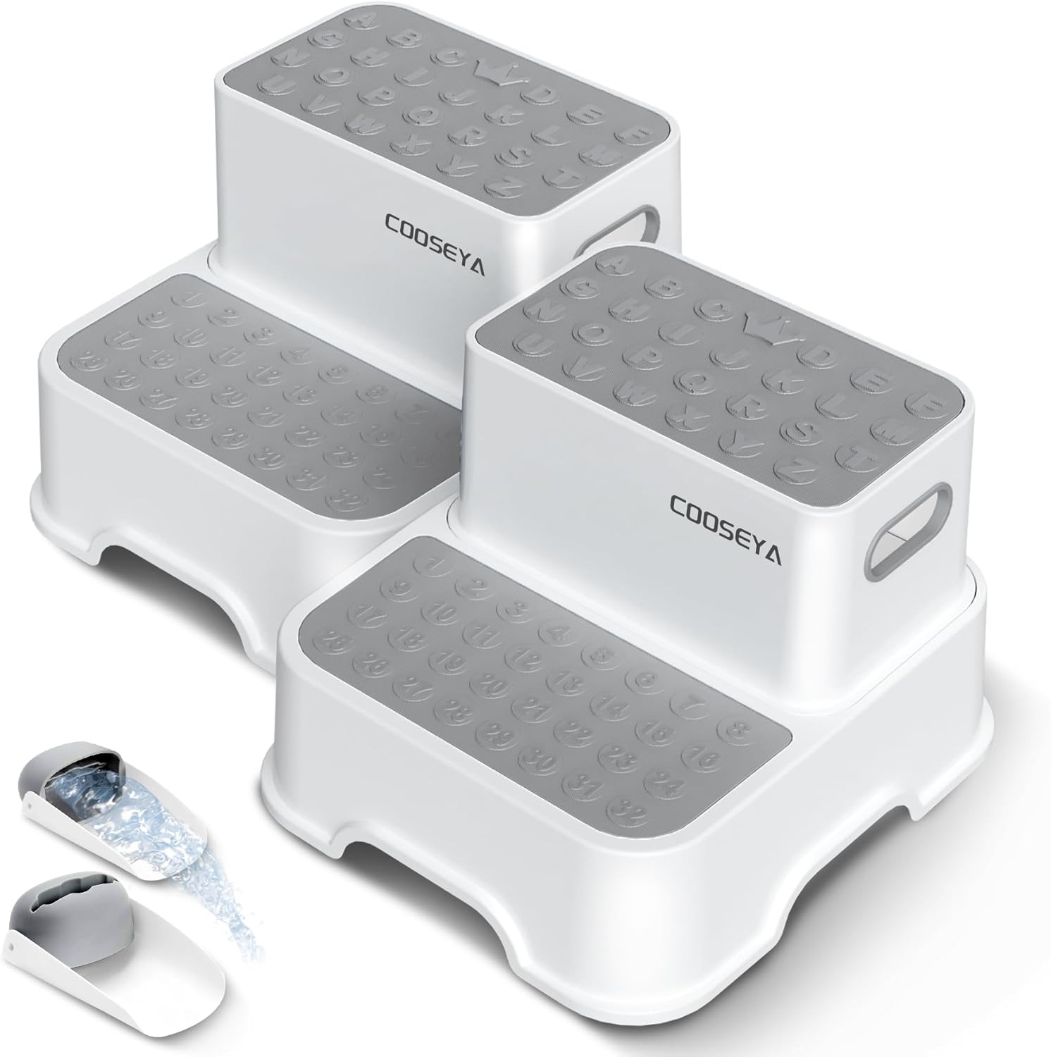 With a durable double-layer construction, these step stools provide extra height and support for your childâs developing independence. The smooth, rounded edges are gentle on knees and skin, ensuring a safer experience every time. Plus, the eye-catching letter and number patterns turn everyday bathroom tasks into fun learning moments, making playtime and productivity go hand in hand.