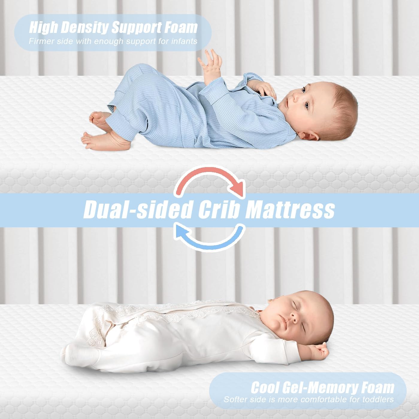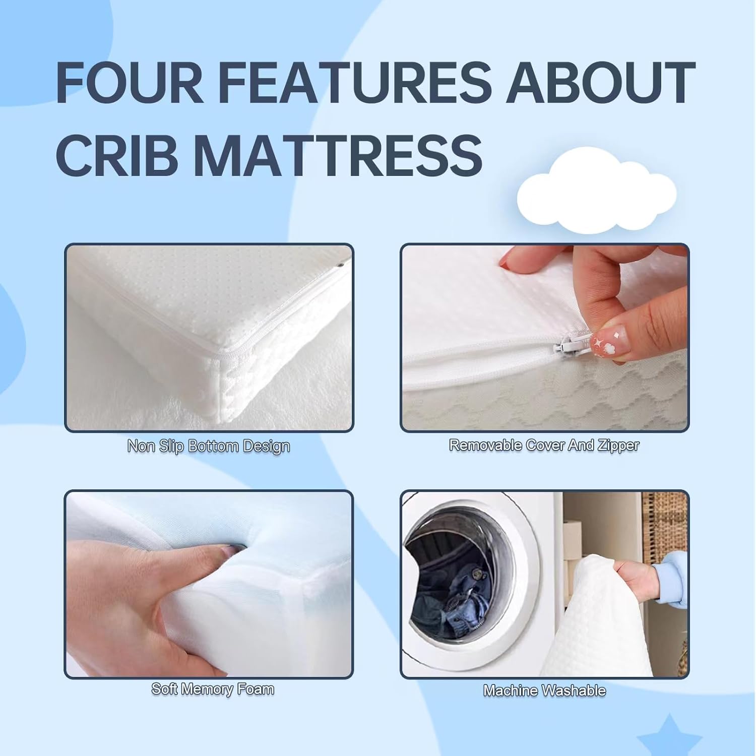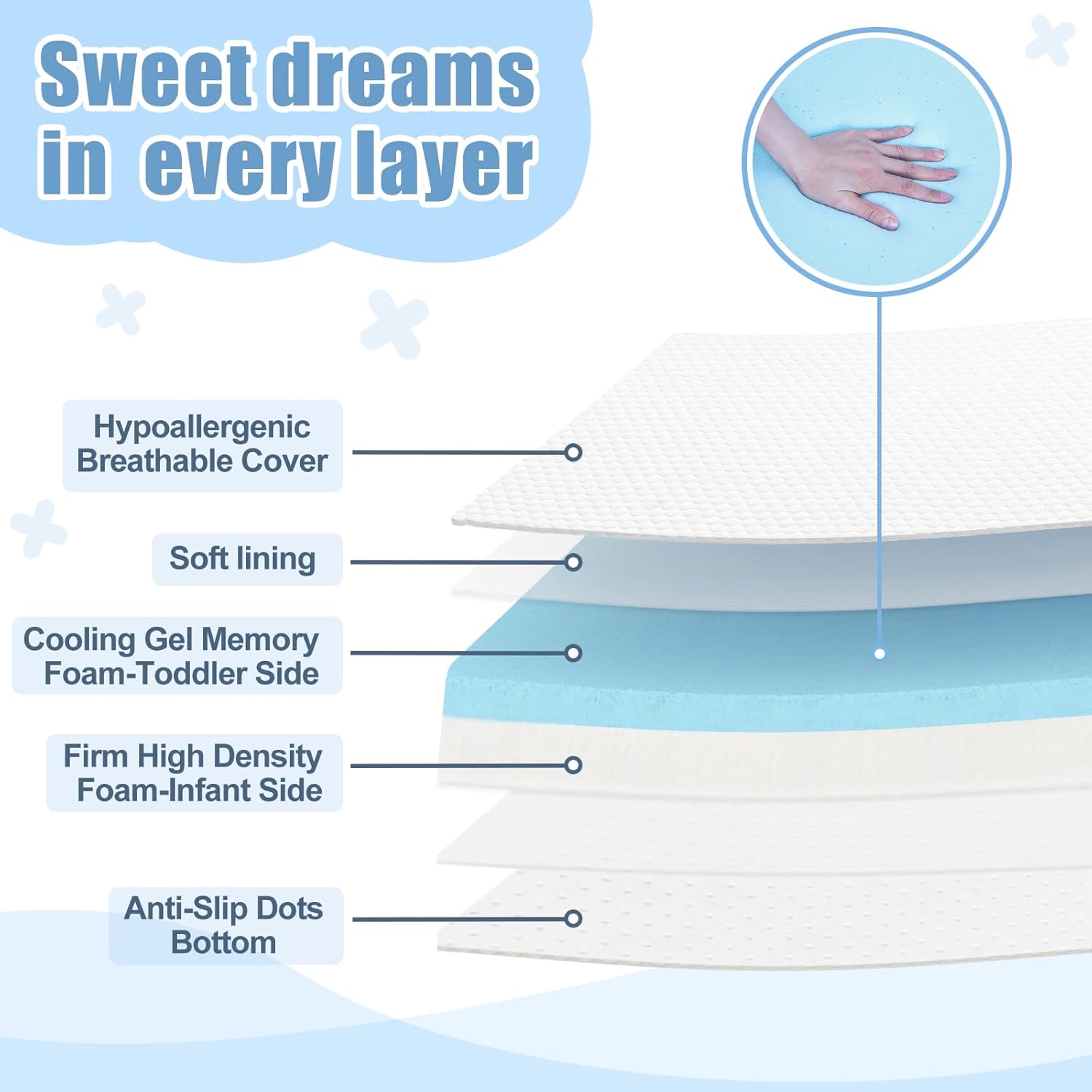 This mattress pad also includes a cooling gel layer and high-density foam to help regulate your baby's body temperature, promoting a calm and restful sleep. The non-slip base and rounded corners offer added stability and protection, keeping your baby safe from slips and bumps. Its lightweight and portable design makes it ideal for travel or everyday use, whether you're on the go or staying at home.