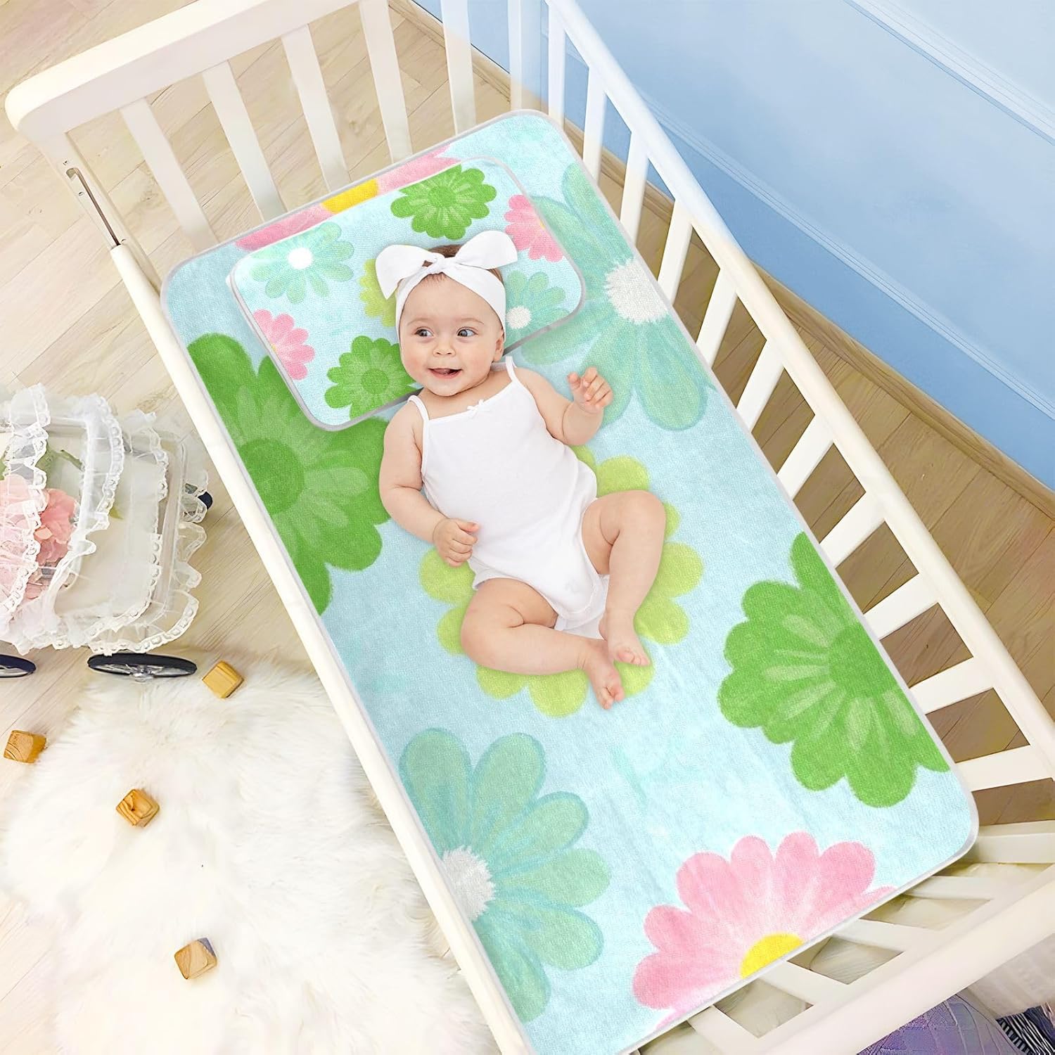 The ultra-soft knit construction is gentle on your babyâs delicate skin, making it ideal for those with sensitive skin conditions. Whether your little one is napping or playing, this mattress pad protector stays with them, providing all-day comfort and a touch of style with its beautiful floral peach blue design. Plus, it's incredibly easy to maintainâjust toss it in the washing machine and enjoy fresh, hygienic sleep every time.