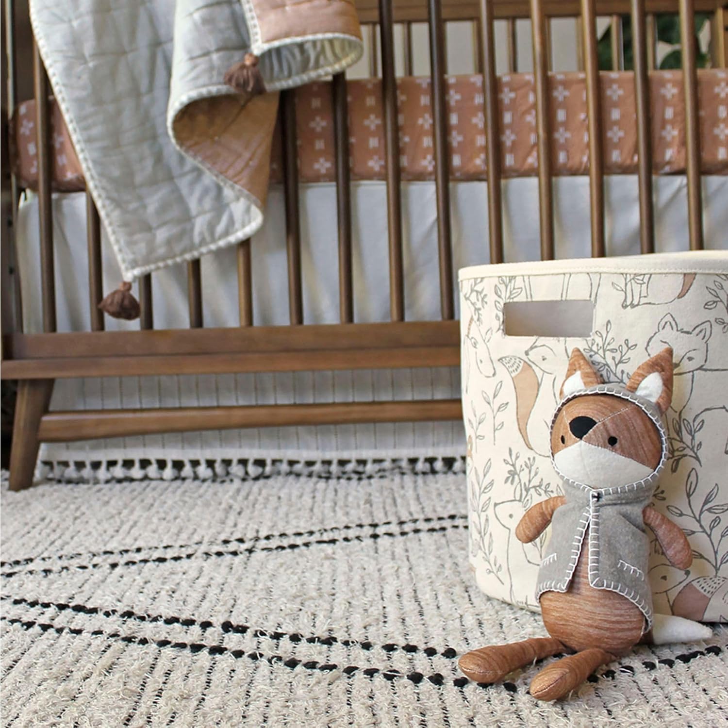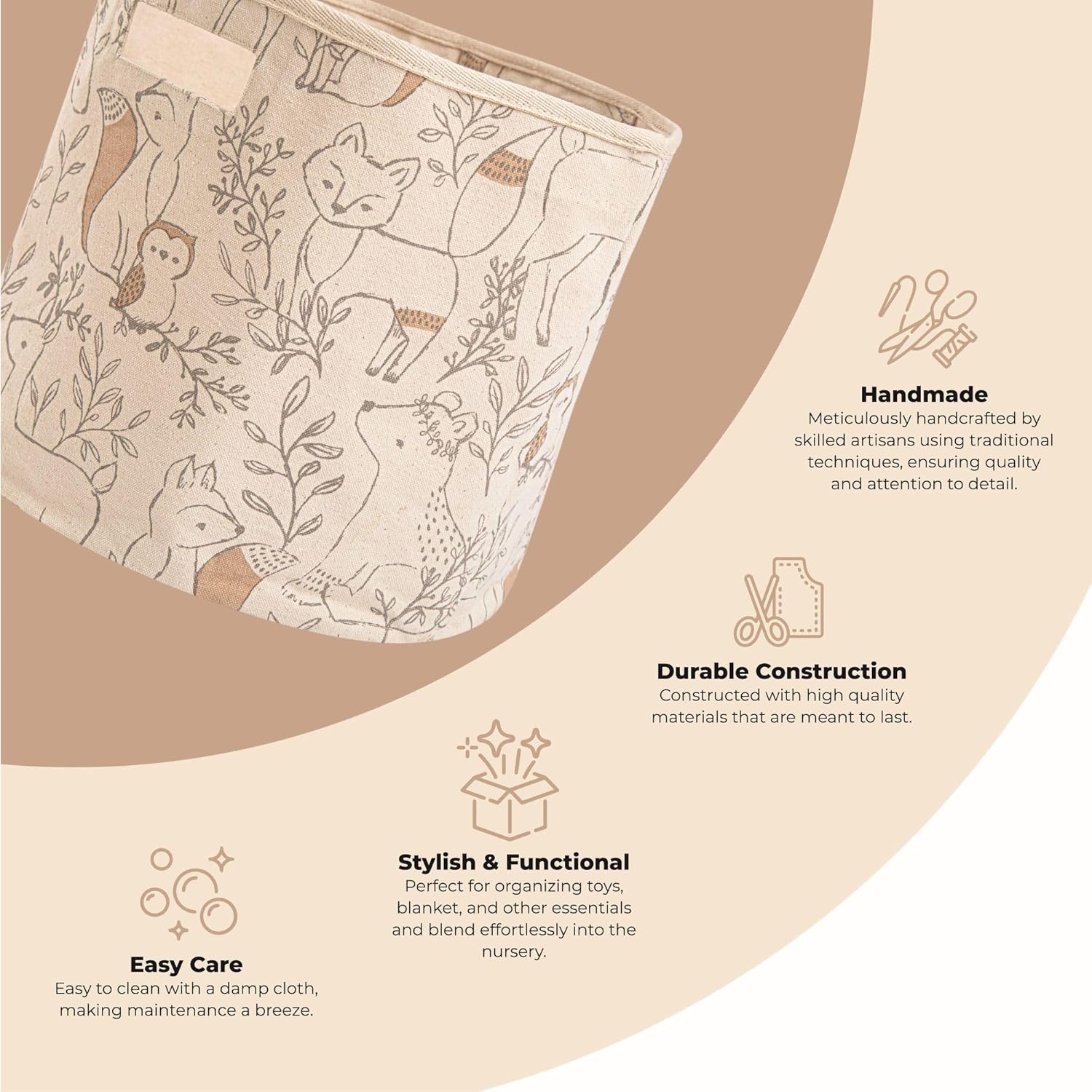 This nursery storage basket brings both style and practicality to your baby's room. Designed with a charming woodland pattern and soft fabric, it's perfect for storing toys, books, and other essentials in a way that complements your decor while keeping your space tidy.