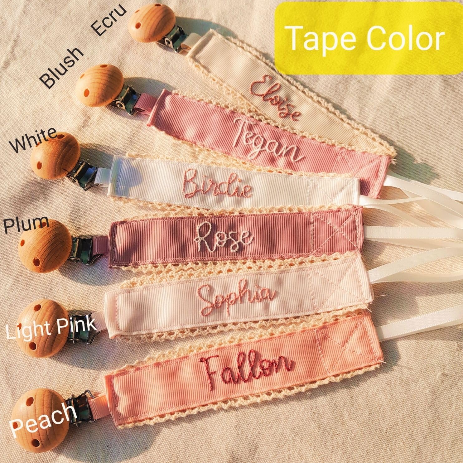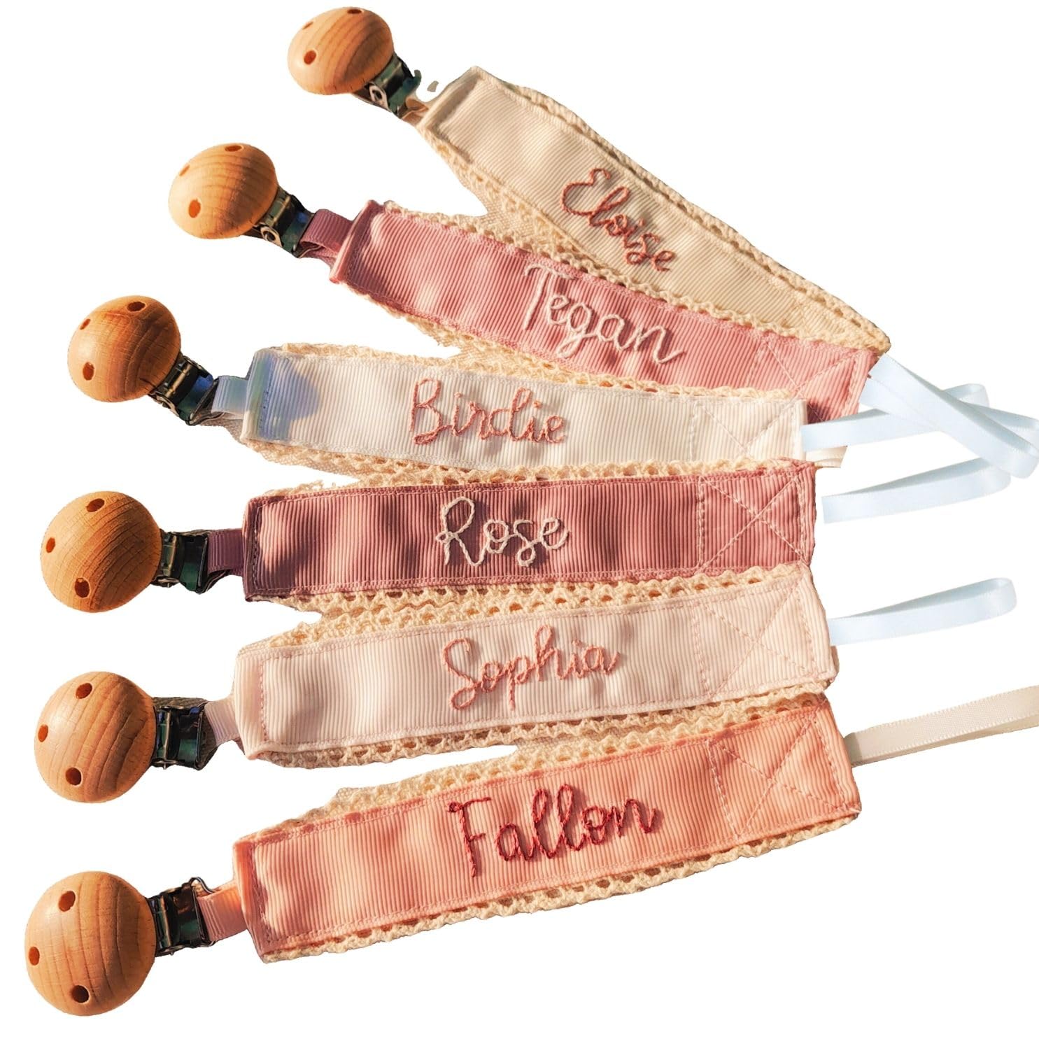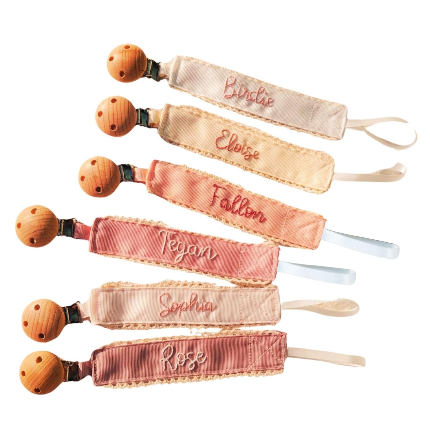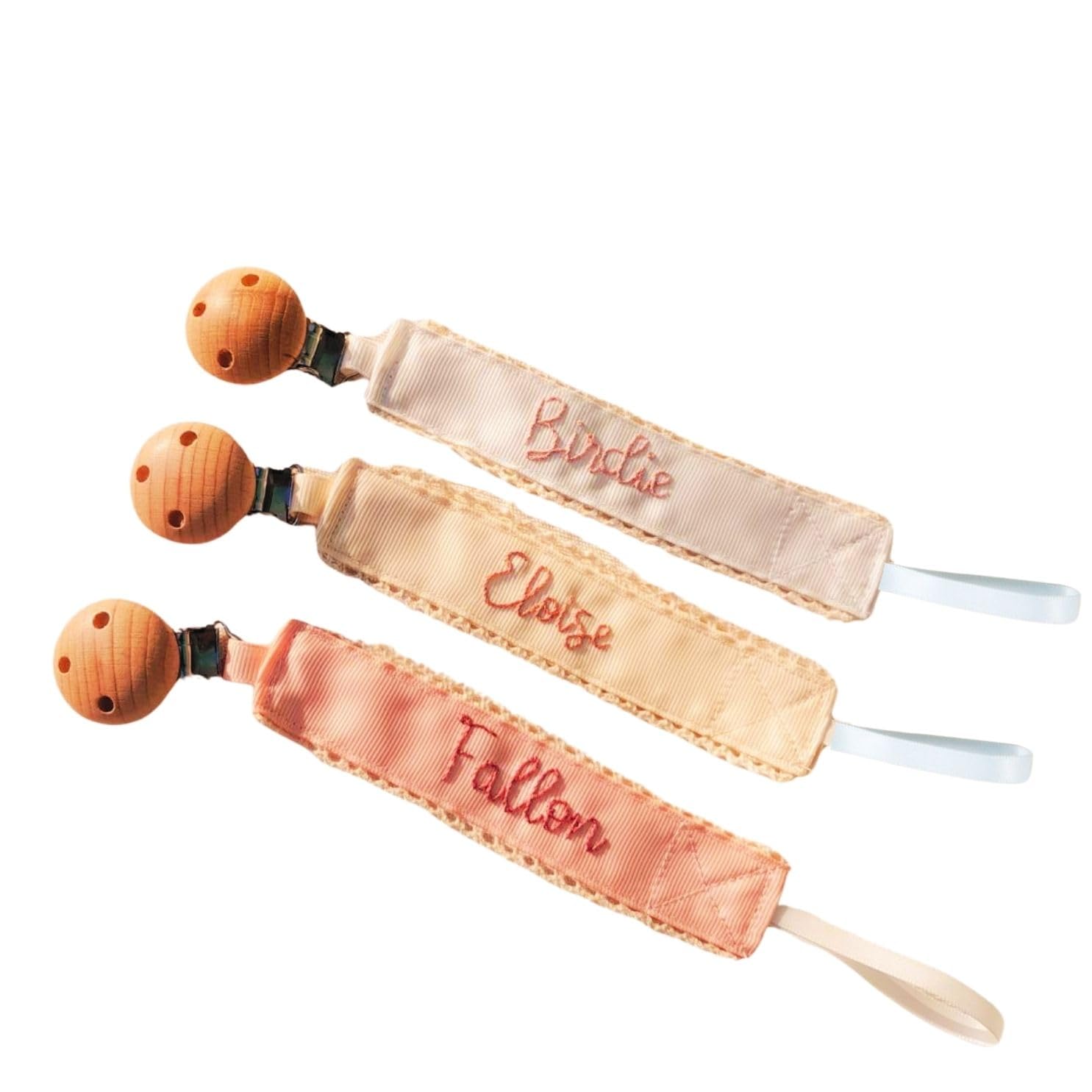 A customizable, handmade pacifier clip with a wooden attachment that fits most pacifiers and teething toys. Made of soft 100% polyester, available in multiple colors, and ideal for baby shower gifts or everyday use. Safe and machine washable.