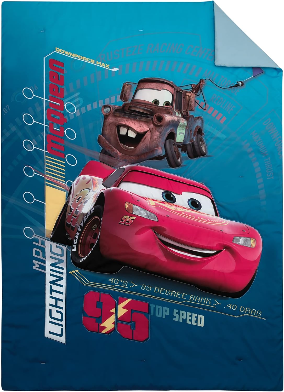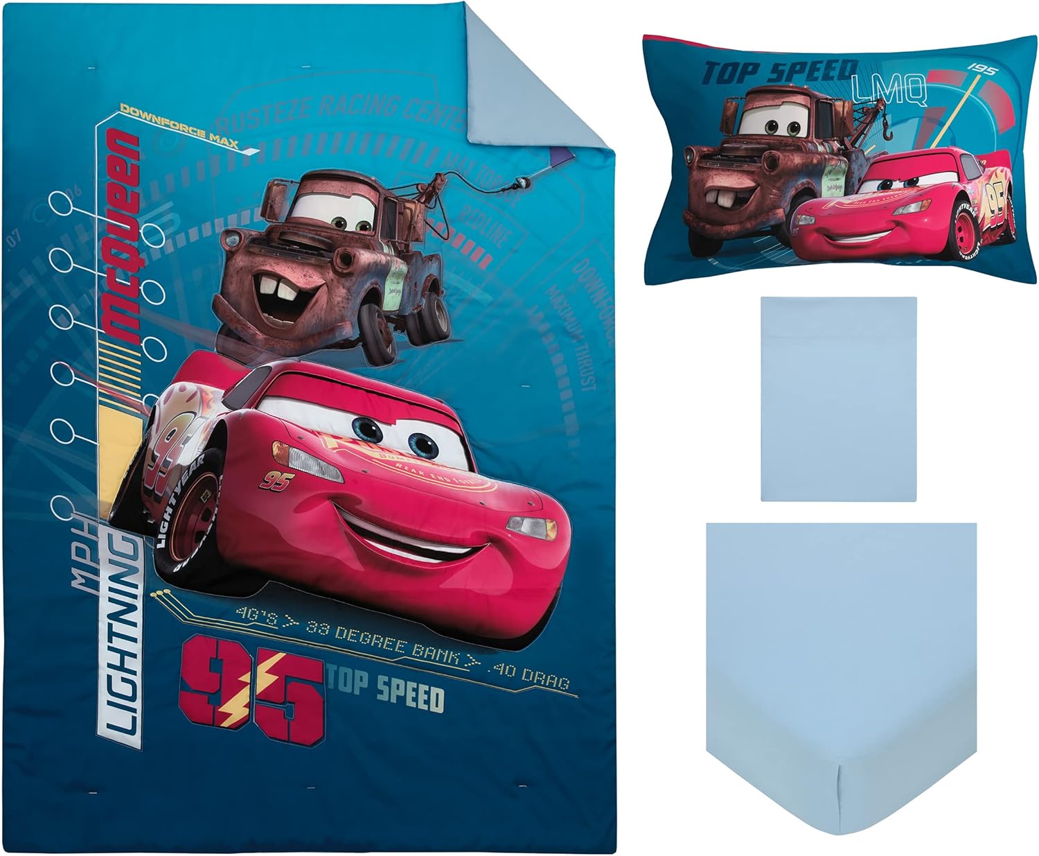 Bring the thrill of the racetrack to your little oneâs room with this eye-catching 4-piece bed set. Inspired by the beloved characters Lightning McQueen and Mater, it adds a touch of fun and adventure to your childâs sleeping space.