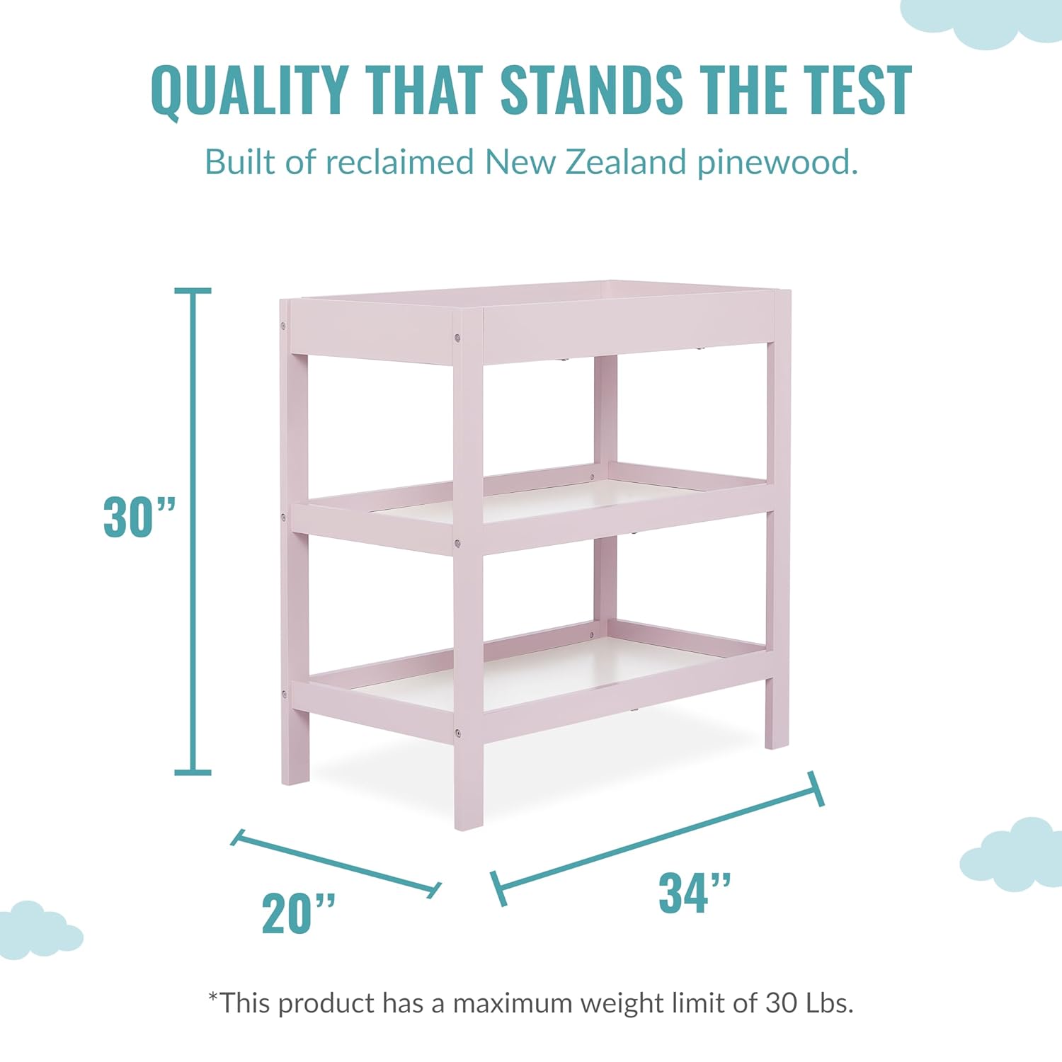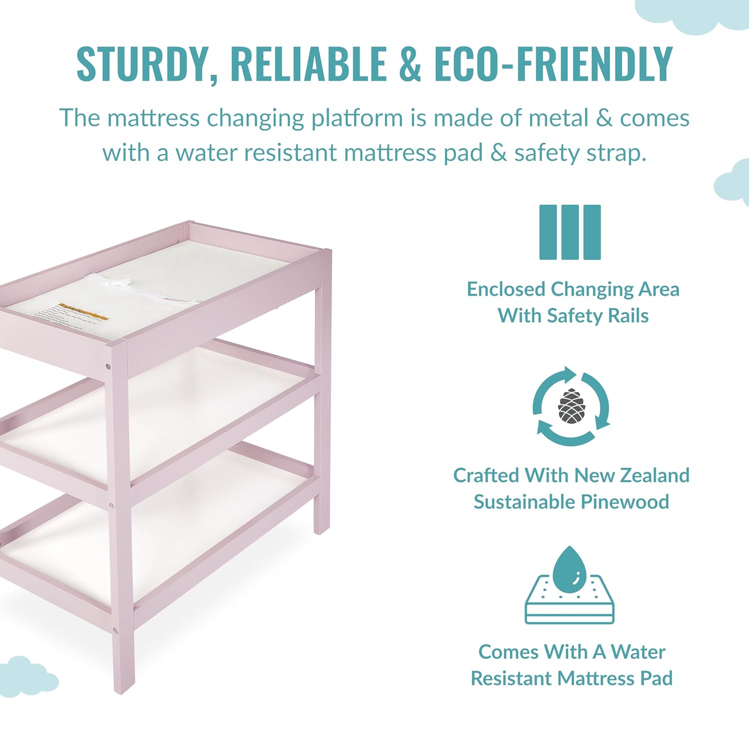 A timeless and versatile addition to your nursery, the Ridgefield Changing Table is designed to grow with your child. Its elegant blush pink and white finish brings a touch of sophistication to any baby room while offering a durable, eco-conscious build made from reclaimed New Zealand pinewood. Built with both function and style in mind, this changing table transforms as your baby grows, starting as a practical changing station and evolving into an adorable nightstand for years to come.
