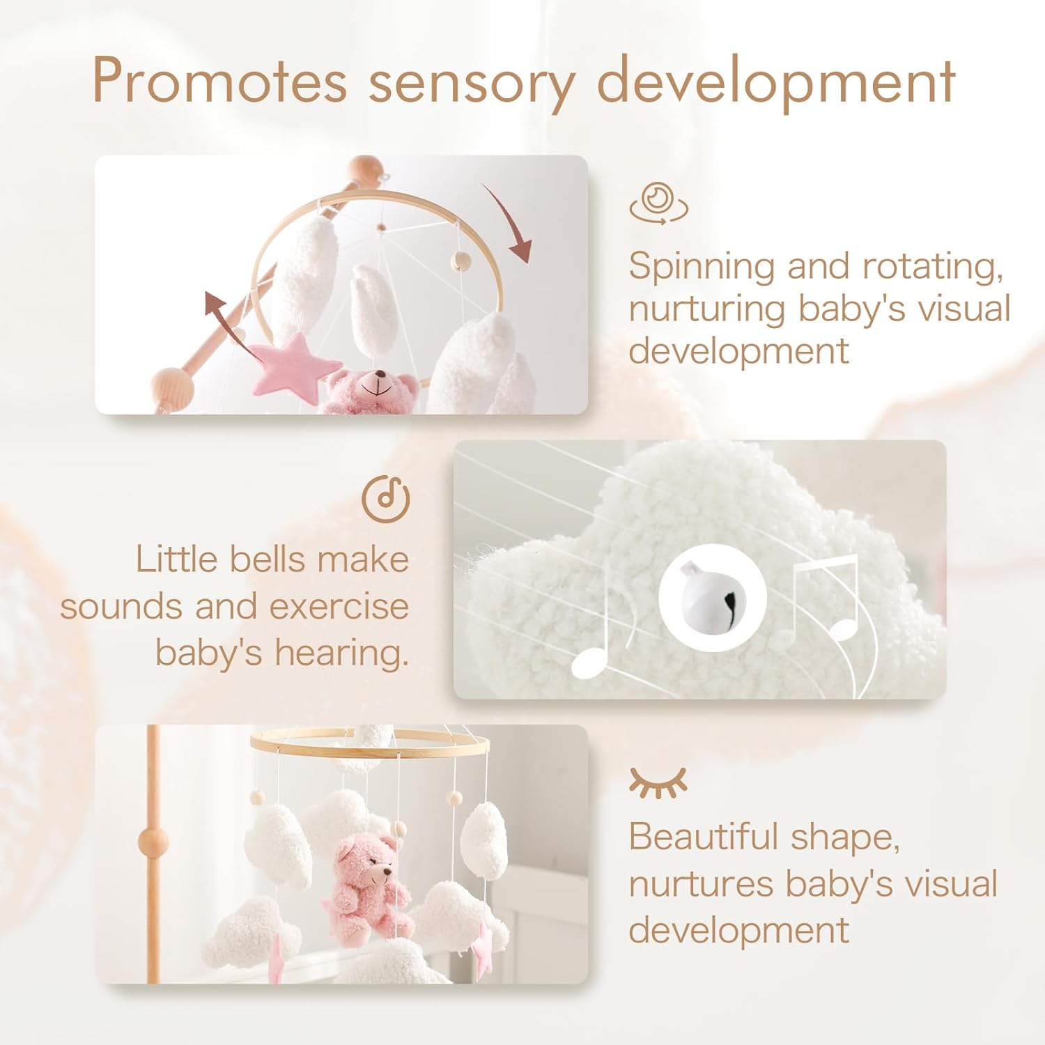 Handcrafted with care, it features soft teddy velvet and durable natural wood, ensuring both safety and long-lasting use. The elegant design with a pink bear, white moon, and pink stars helps calm your baby while encouraging early sensory exploration.