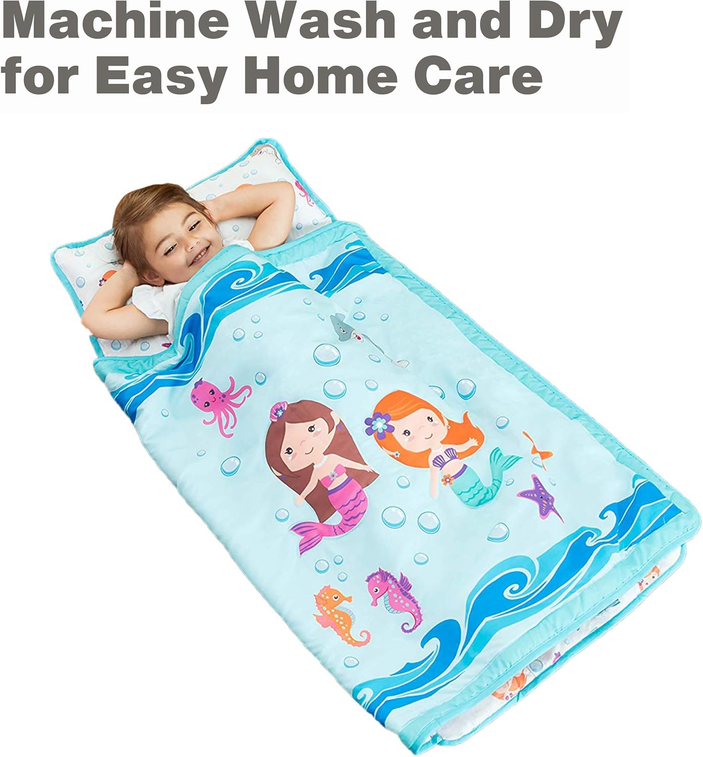 With its adorable underwater mermaids design, this nap mat is not only functional but also eye-catching and calming, creating the perfect atmosphere for bedtime. The name tag window adds an extra layer of convenience for easy identification, while the secure fastening straps keep everything in place during use.