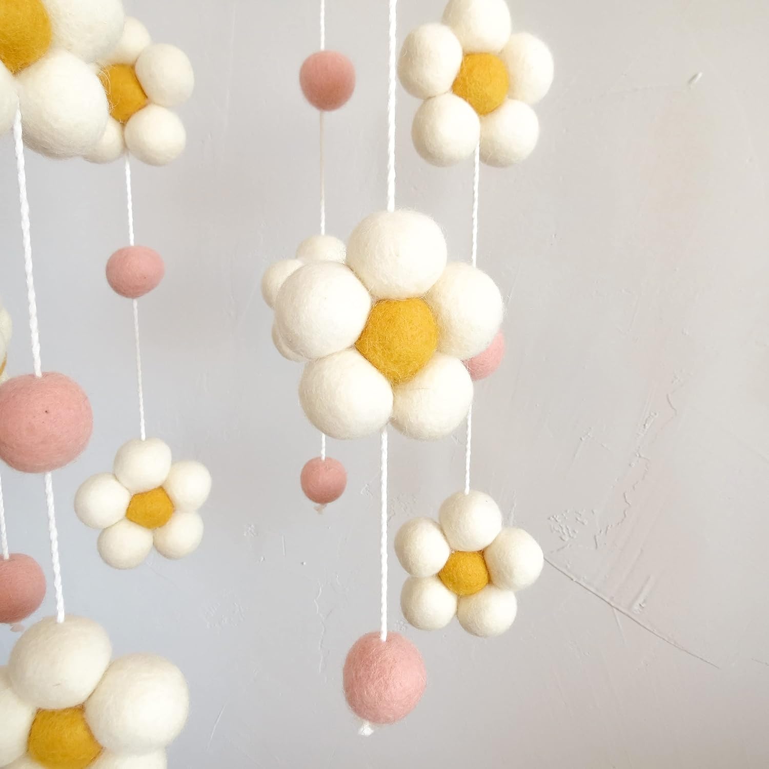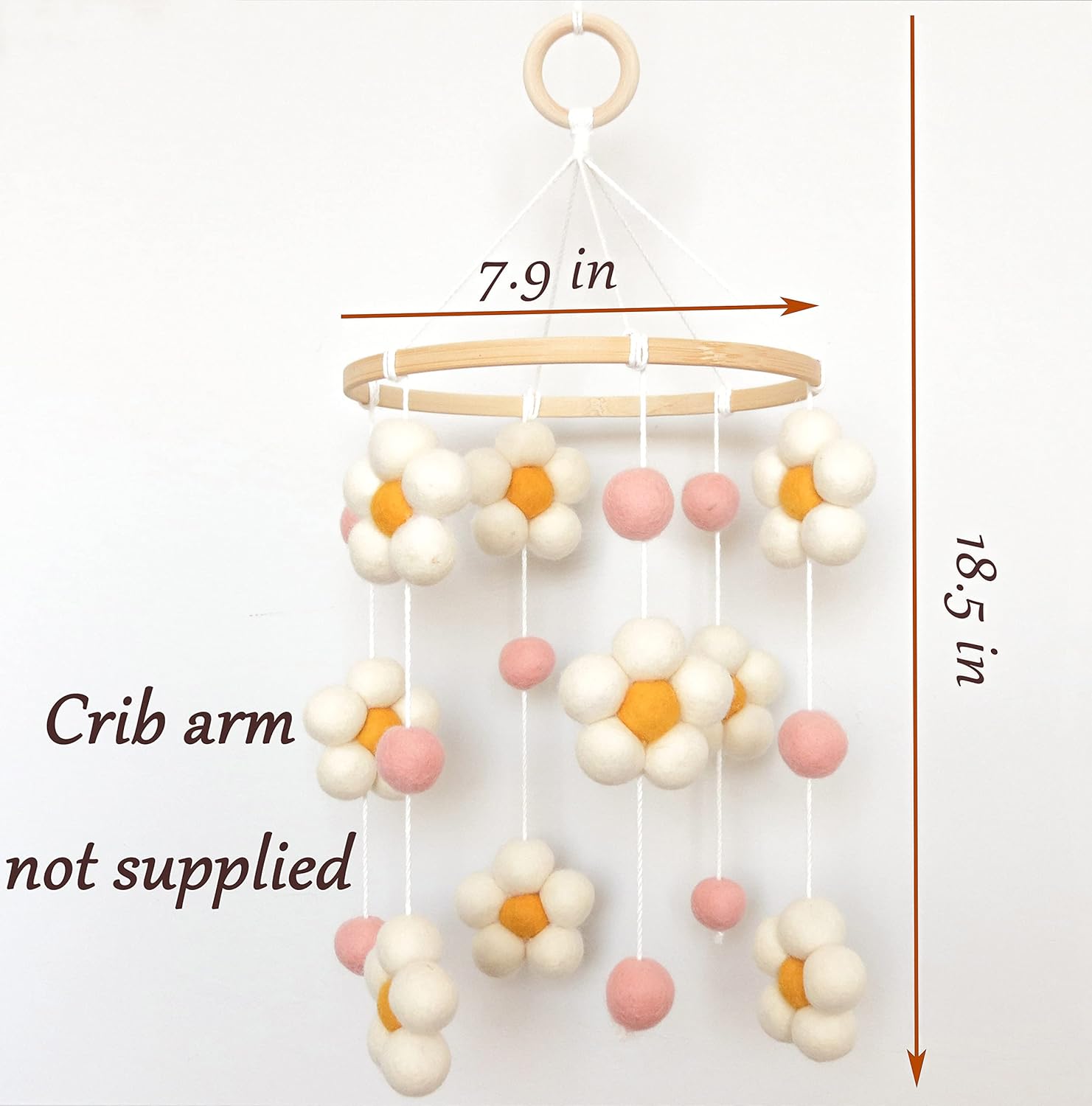 This baby crib mobile adds a calming aesthetic to your nursery with its soft pink felt flowers and white daisies. Designed to gently rotate and capture your baby's attention, itâs more than just a decorationâitâs a tool for sensory development and a source of comfort during sleep.