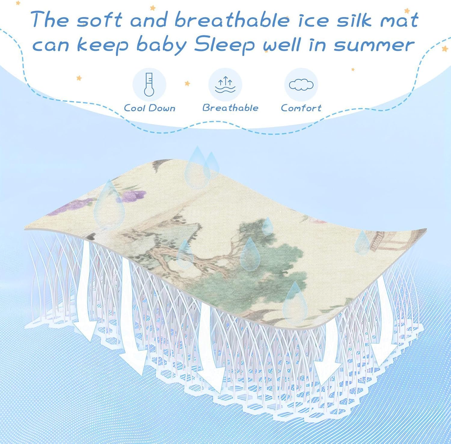 A cooling and breathable mattress pad designed for babies and toddlers. Made with soft and skin-friendly materials, it provides comfort and protection for a restful sleep. Ideal for use in summer and a great gift for baby showers or birthdays.