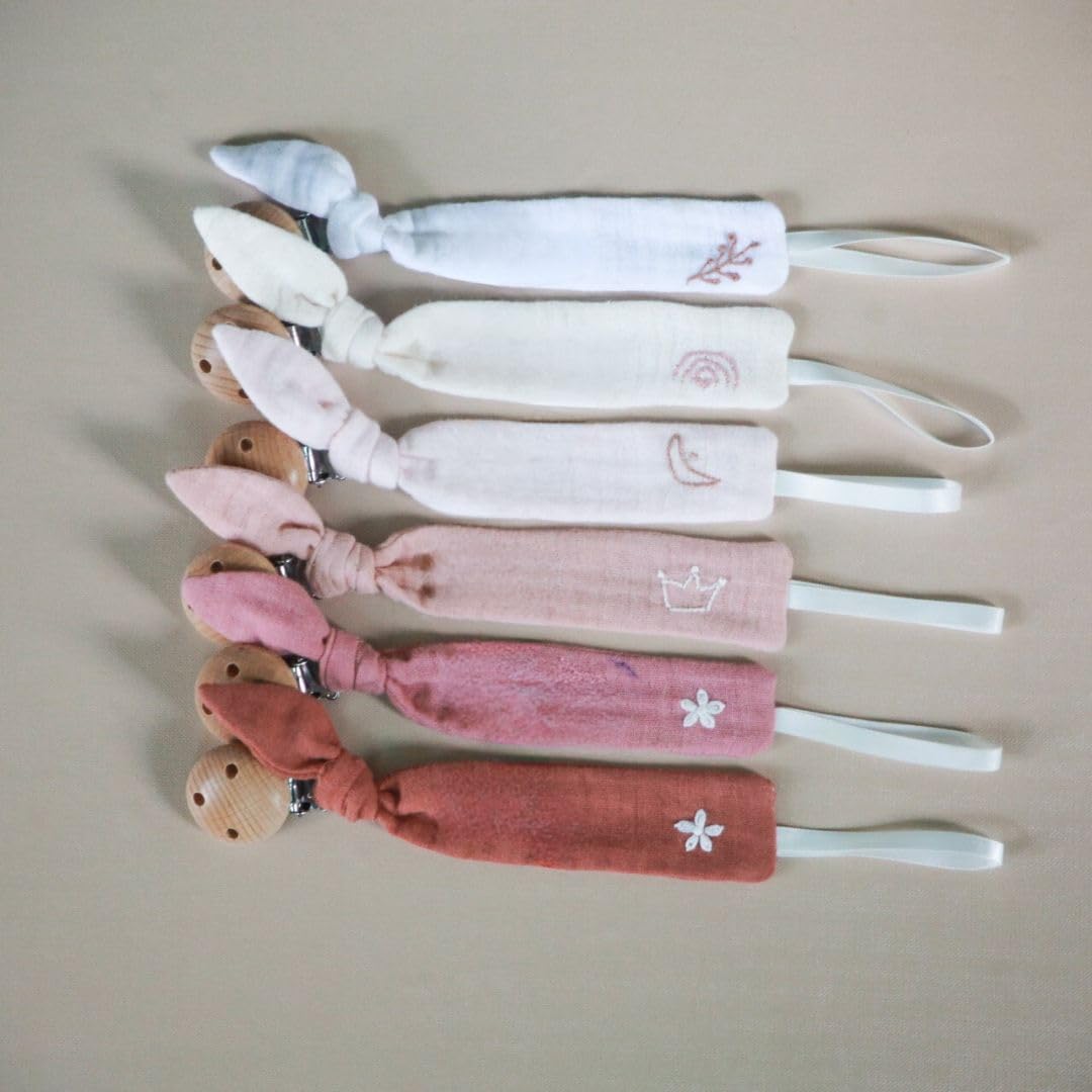 Designed with care for your little one, these pacifier clips are gentle on your baby's skin and perfect for keeping their pacifier or teether secure and clean. Crafted from 100% cotton, they provide a soft, comfortable grip, while the charming wooden head adds a natural and safe touch to your babyâs daily routine. Each clip is equipped with a strong, snag-resistant metal clasp, ensuring it stays attached and doesnât damage clothing. Ideal for use in the nursery or on the go, they are a practical and stylish addition to any baby gear collection.