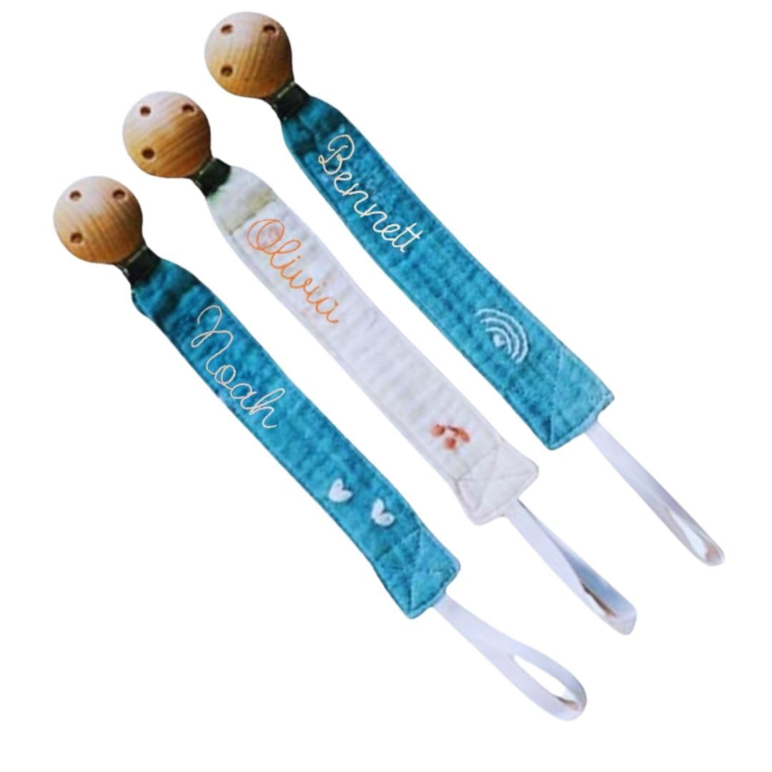This handmade pacifier clip is the perfect combination of style and practicality, designed to keep your baby's pacifier secure and clean all day long. Each clip is crafted with care, featuring a one-of-a-kind embroidery that adds a special, personal touch, making it a cherished item for your little one.
