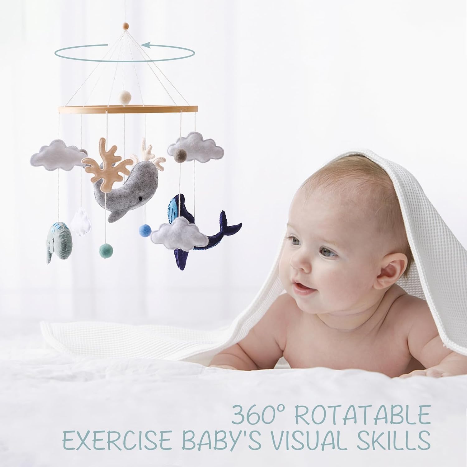 This elegant Montessori baby mobile is crafted to gently sway and mesmerize your little one, offering hours of soothing entertainment. Its soft, realistic ocean animal shapesâlike the majestic blue whale and fluffy white cloudsâcreate a calming visual display that captures your baby's attention and nurtures their early development.