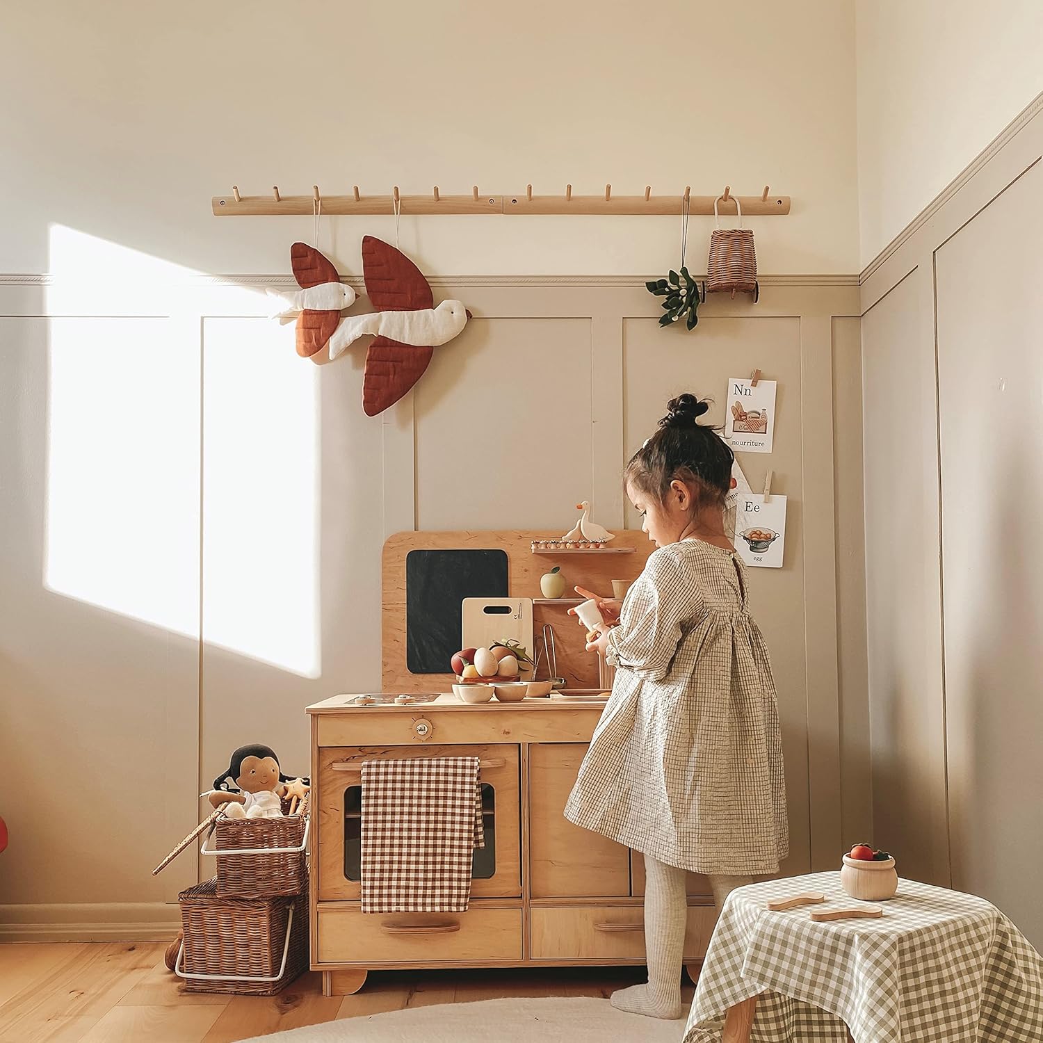 A safe and beautifully crafted wooden pretend kitchen for toddlers, designed with Montessori principles in mind. Perfect for playroom or nursery decor, it’s a fun and educational learning toy for kids. Easy to assemble, durable, and available in two colors.