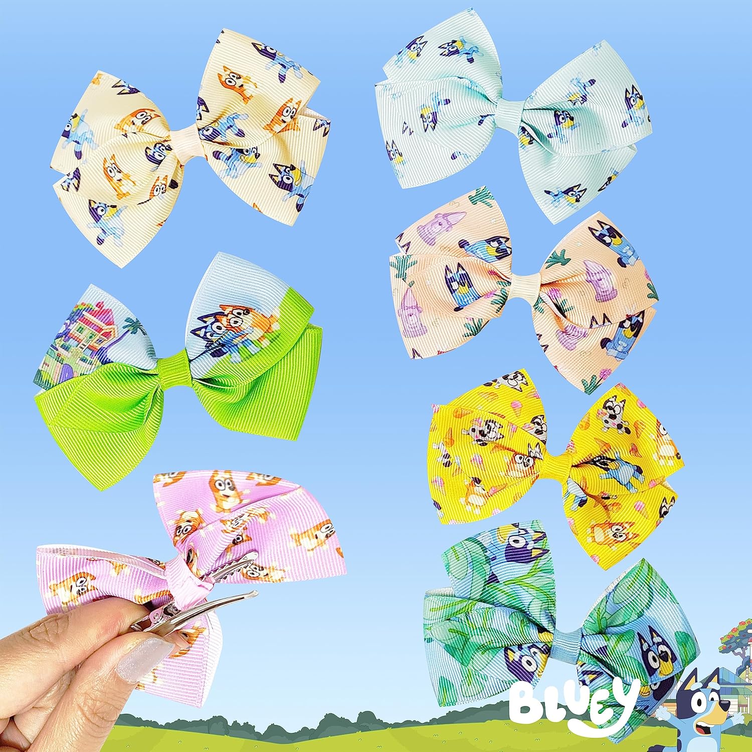 This charming Bluey hair bow set is the ideal way to add a touch of whimsy to any little girlâs everyday style or special occasion look. With 7 different prints on each bow, itâs not just eye-catchingâitâs also designed to make her hair look neat and tidy, no matter the activity. The secure alligator clips keep the bows firmly in place, allowing her to play, explore, or simply feel fabulous without worrying about frizz or flyaways. Each piece is made with care, ensuring safety and fun for young children.