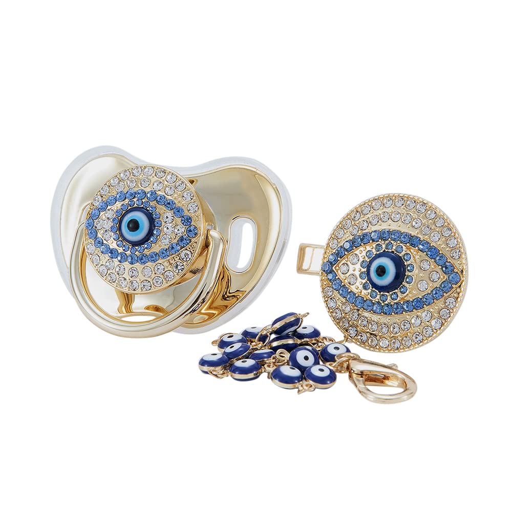A beautiful fusion of style and function, the pacifier features mesmerizing gold and silver accents, complemented by crystal rhinestones that add a touch of luxury. It's not just a pacifier â it's a statement piece that elevates your babyâs essentials with a touch of elegance.