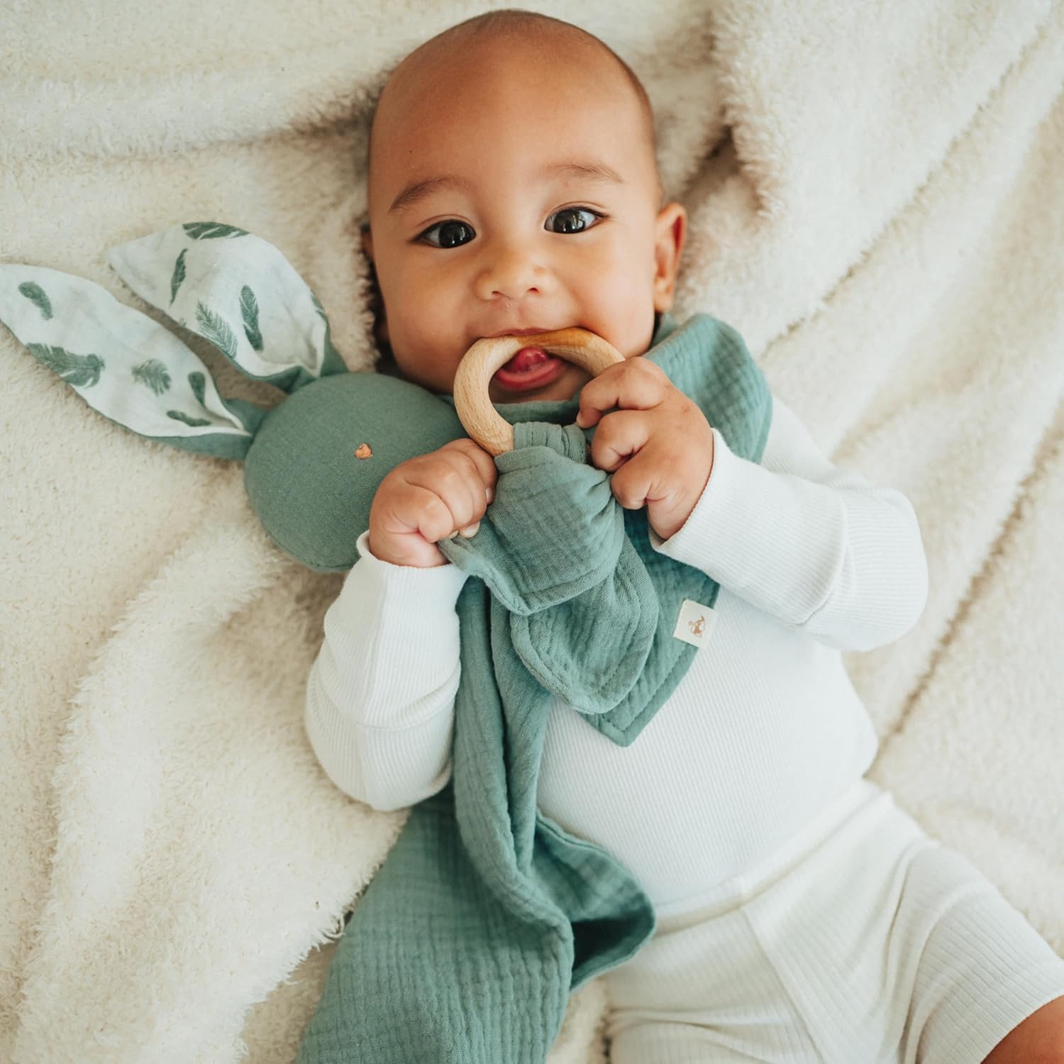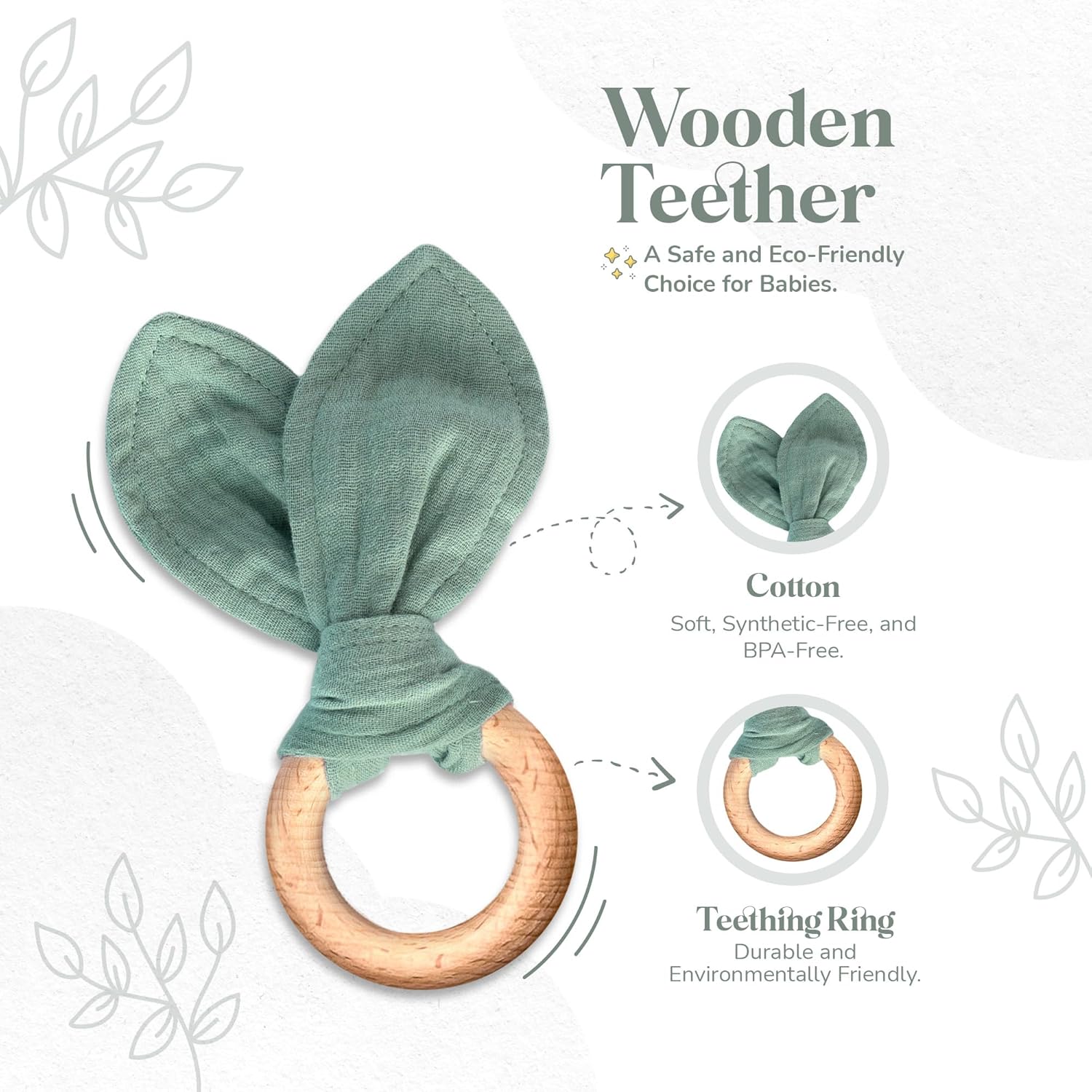 This set includes a bunny ear muslin lovey, an adjustable bib, a wooden teether, and a baby announcement sign, making it ideal for different aspects of your babyâs early life. The muslin lovey provides comfort and can be used for swaddling or feeding, while the wooden teether is safe for teething relief with rounded edges.