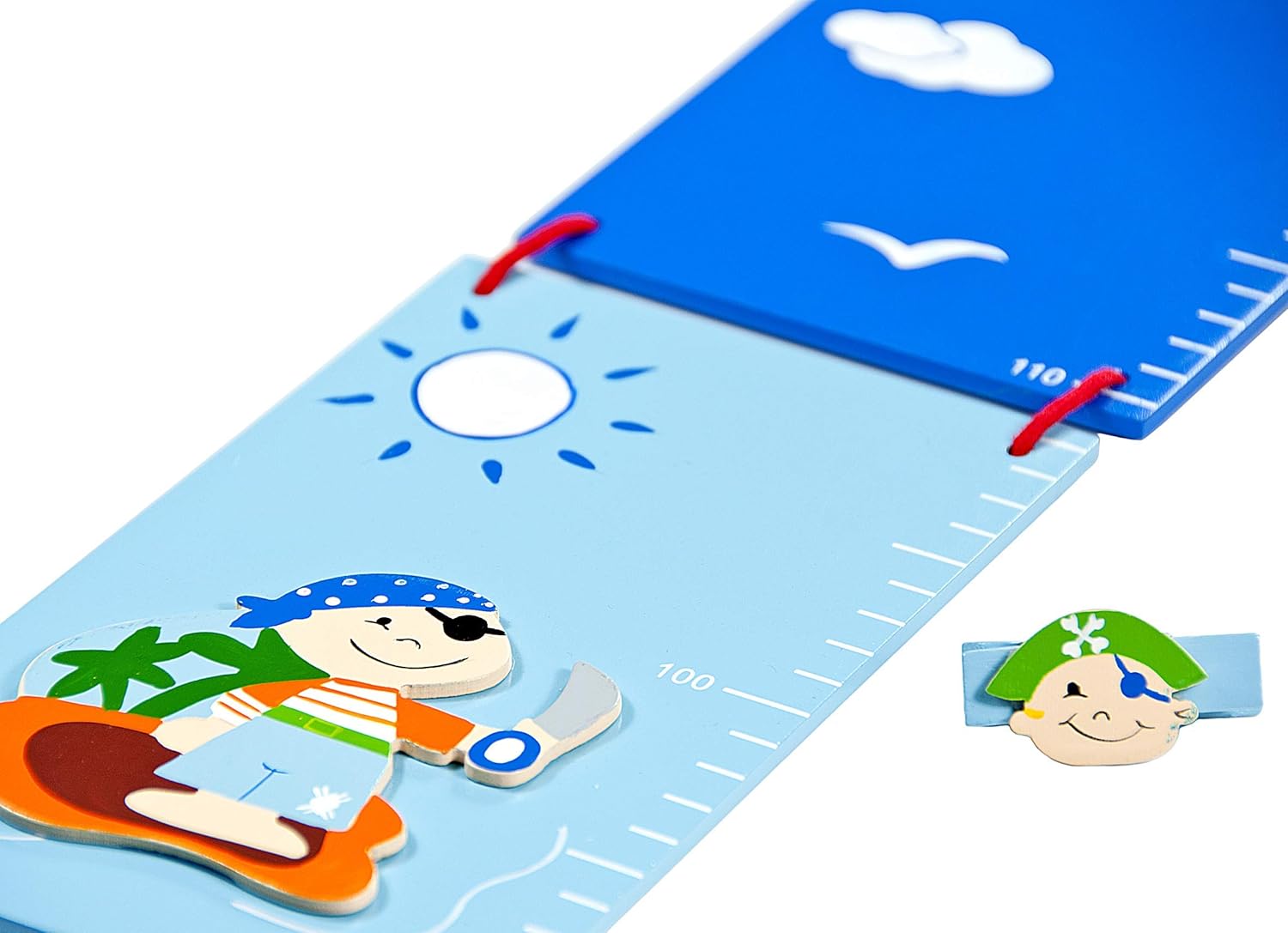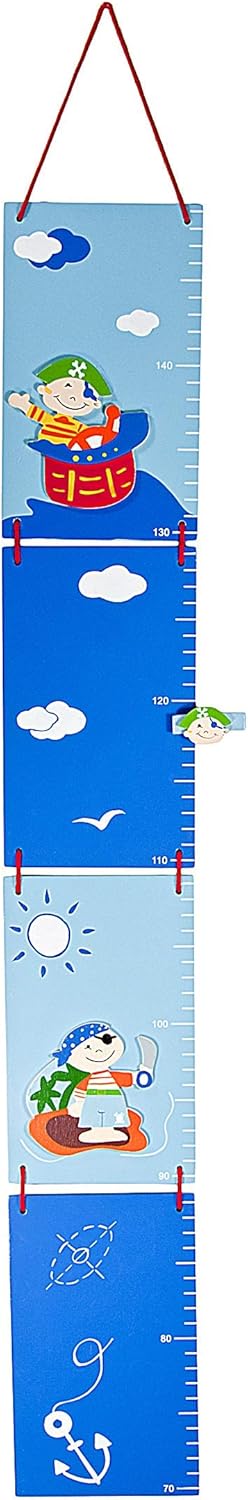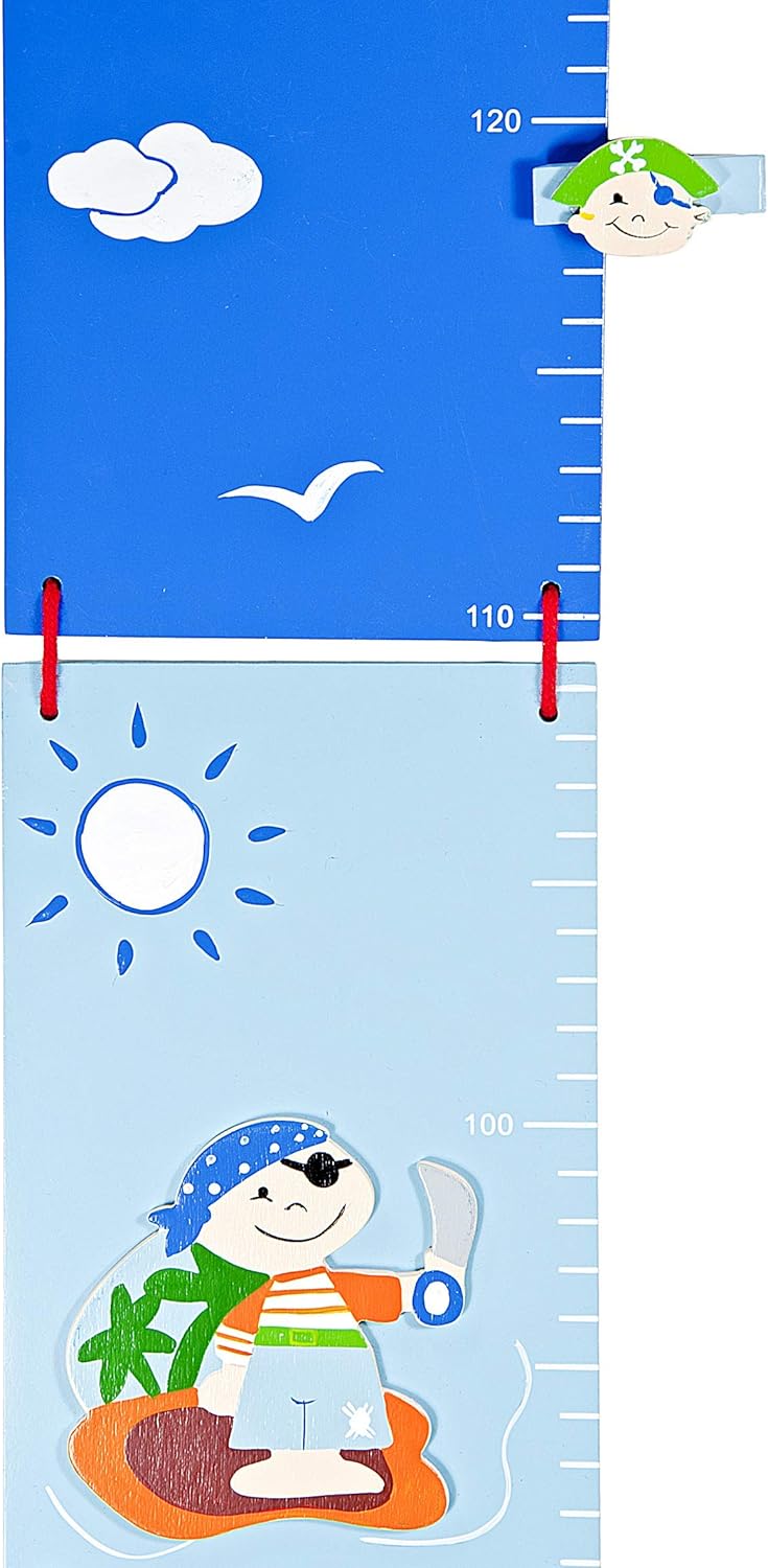 This blue wooden growth chart is the perfect way to make tracking your child's height an exciting and memorable experience. Infused with a nautical pirate design, it adds a playful and adventurous touch to your child's room. Featuring two cheeky pirates in a sea and boat scene, itâs not just a chartâit's a story of growth, imagination, and fun.
