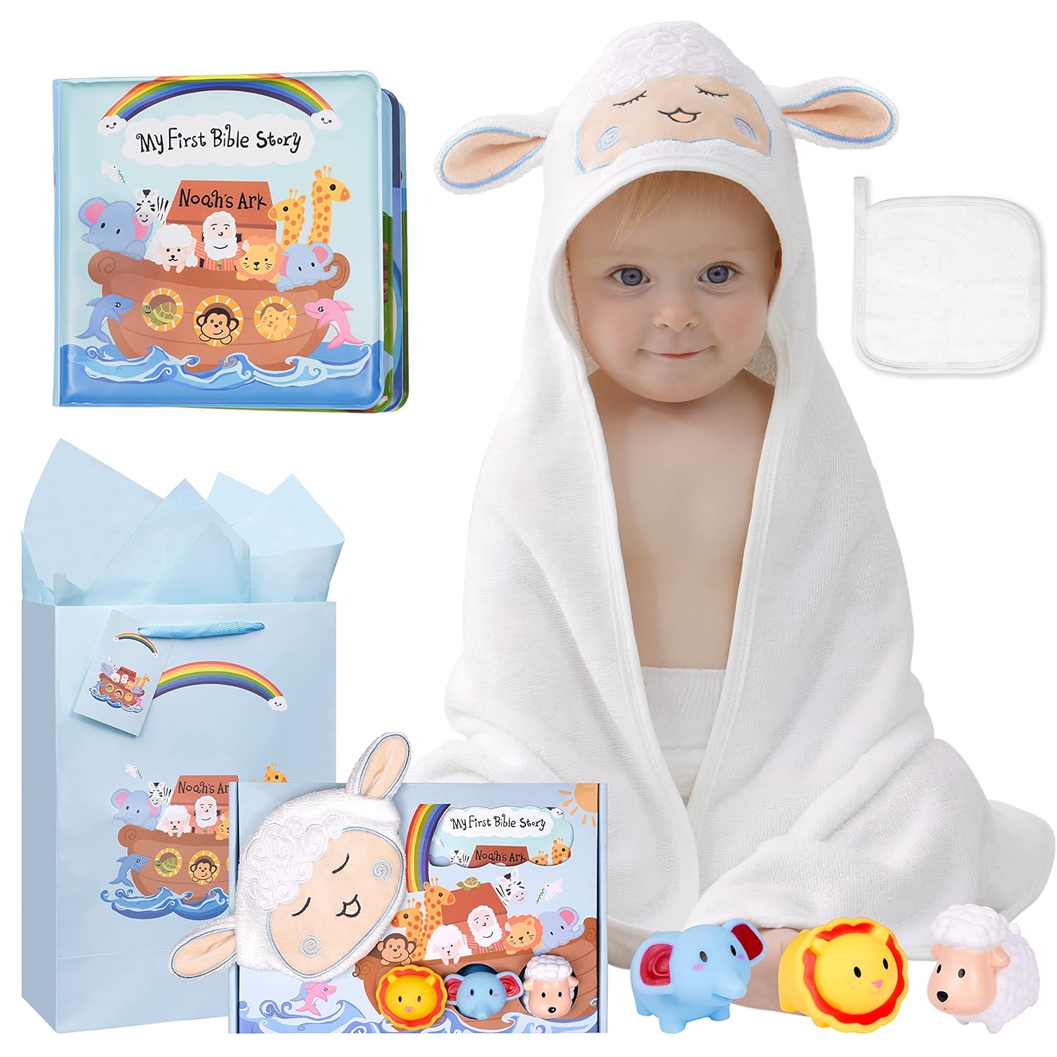 The set includes a themed bath book that helps teach young children about the world, along with three floating bath toys that keep them entertained and engaged during bath time. The included ark-shaped gift box, tissue paper, and attached tag make it easy to present as a cherished gift, especially from grandparents, aunts, or godparents.