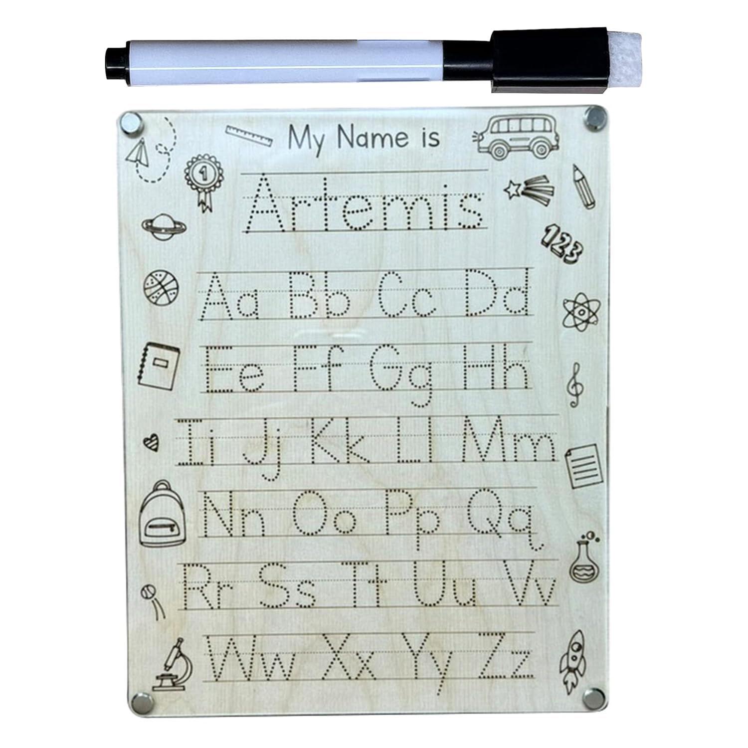 This personalized name trace board is the perfect early learning tool for young children to practice writing in a safe, fun, and interactive way. Crafted with durable Baltic birch wood and clear acrylic, it's built to withstand hours of play and learning. The smooth, non-rough surface makes it gentle on little fingers, while the personalized name adds a special, meaningful touch to your child's journey. Encouraging proper handwriting and fine motor skills, this board helps kids build confidence as they write their first letters with ease and excitement.