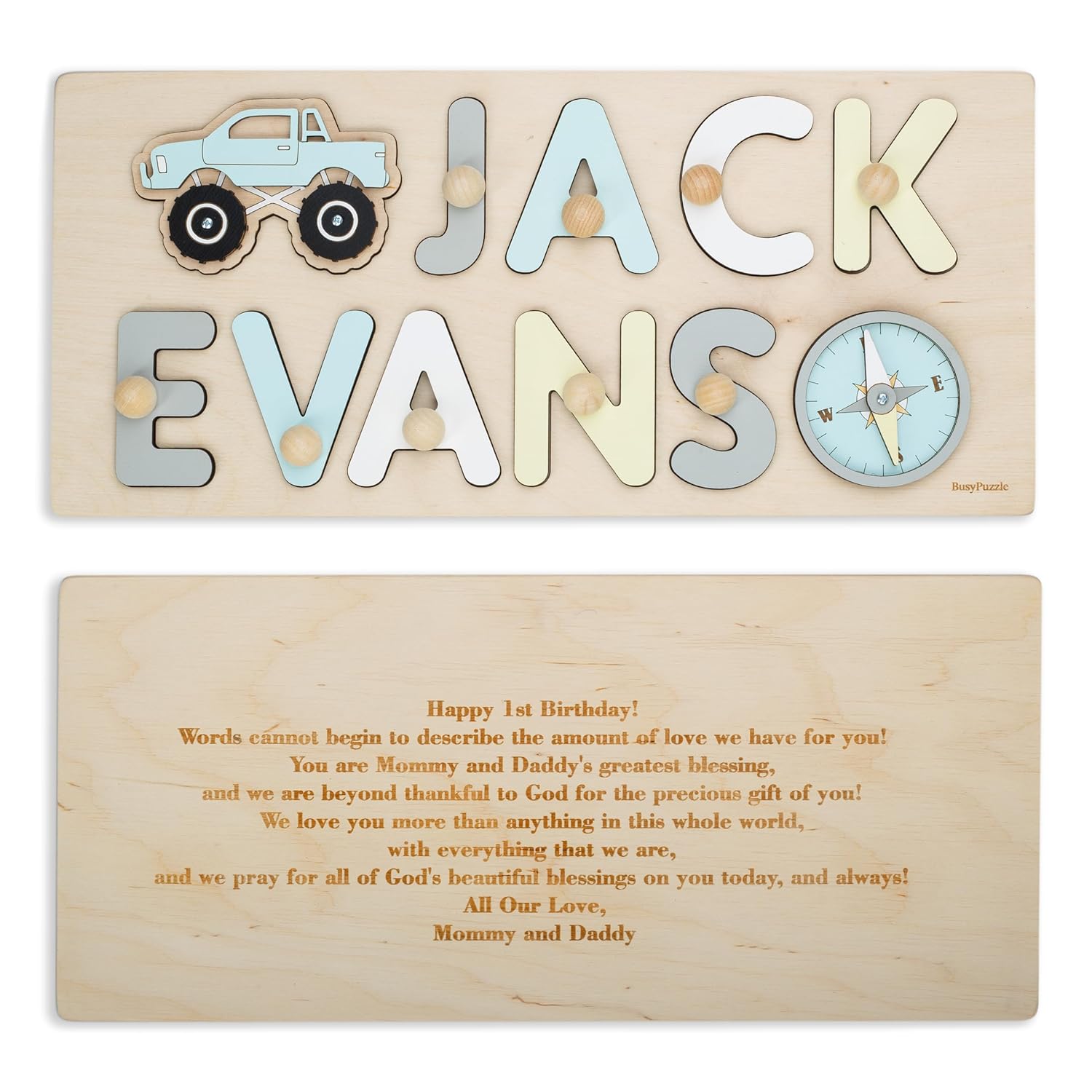 Each puzzle is custom engraved with your child's name or a meaningful message, making it truly one-of-a-kind. It's a perfect gift for birthdays, baby showers, or any special milestone, combining celebration with early learning in a safe and engaging way.