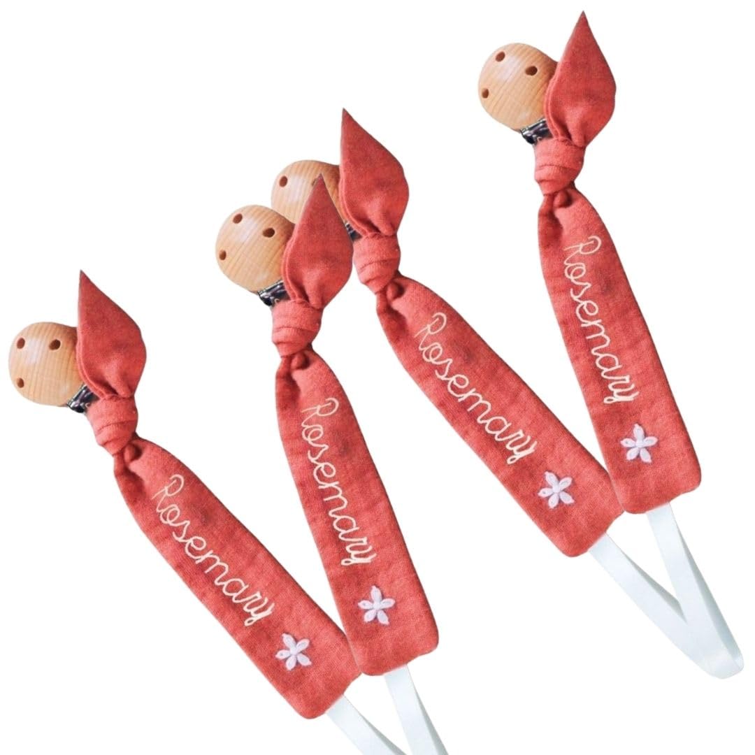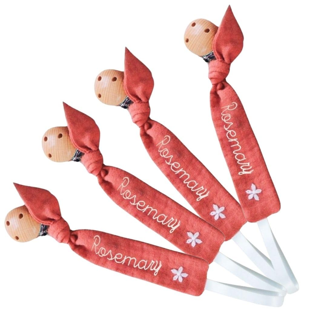 A personalized wooden pacifier clip with unique embroidery, designed for secure and sanitary pacifier storage. Easy to clip onto clothing or stroller, offering a stylish and practical solution for baby essentials.