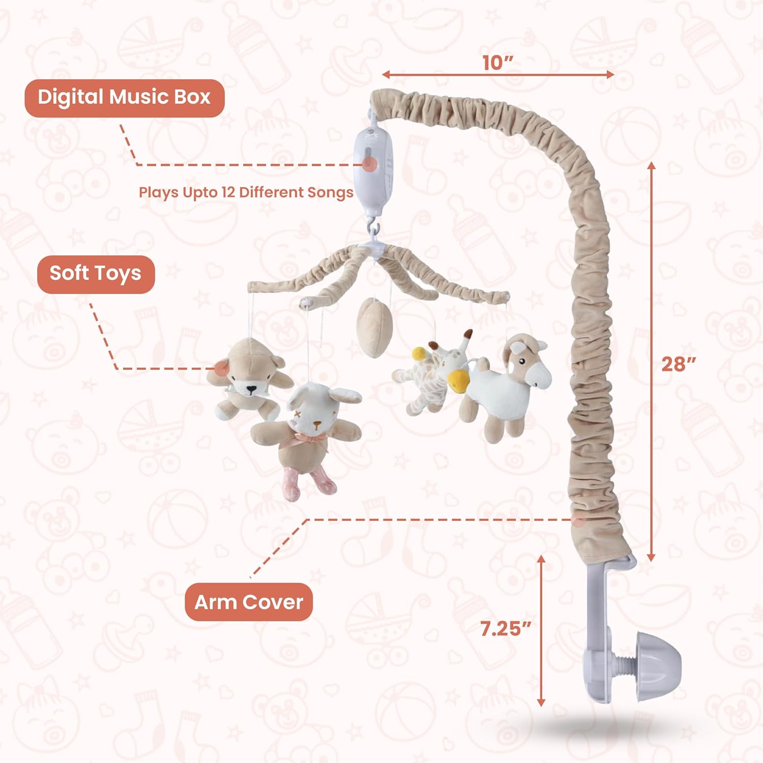 This musical baby mobile is more than just a decorative pieceâit's a thoughtful addition to your babyâs room that supports development and comfort. The plush toys, including four soft animals and a heart, are designed to engage your little oneâs senses and encourage visual tracking, making both playtime and bedtime more enjoyable. The combination of gentle music and soft movement offers a serene, calming experience that helps your baby feel secure and content.