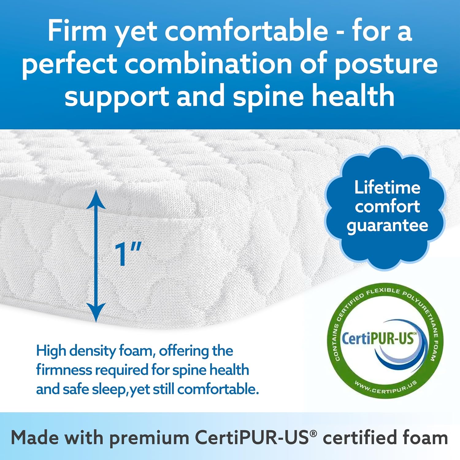 This pack and play mattress is made to fit snugly in 38"x26" units, providing a safe, cozy, and secure resting place for your little one. Its premium foam offers the ideal support for peaceful sleep, helping babies to fall into deep, restful dreams every night.