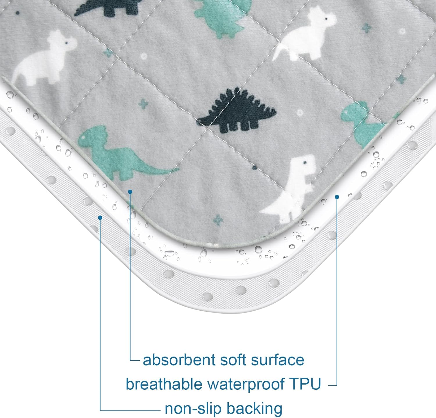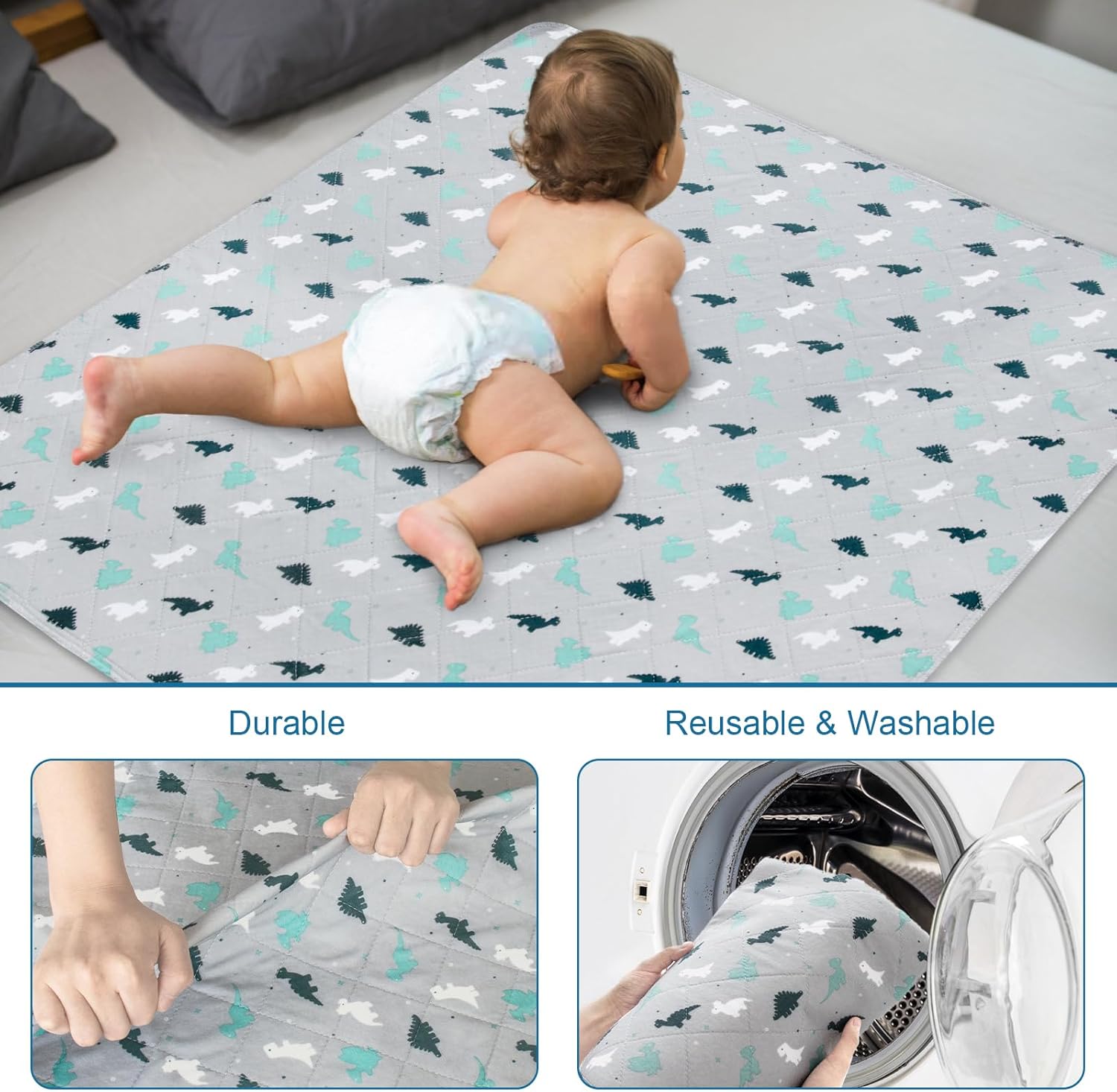 Whether you're helping your toddler with potty training or looking for a reliable bed wetting solution, these pads are an essential addition to your child's room. The 3-layer design ensures maximum absorbency, a waterproof barrier, and secure placement. They are also washable and reusable, making them a cost-effective and eco-friendly choice. The non-slip backing adds extra stability, while the cute dinosaur pattern adds a cheerful and playful twist, encouraging your child to stay positive and excited about learning to use the potty. Ideal for baby mattress protectors, these pads are a perfect fit for modern nurseries and homes.