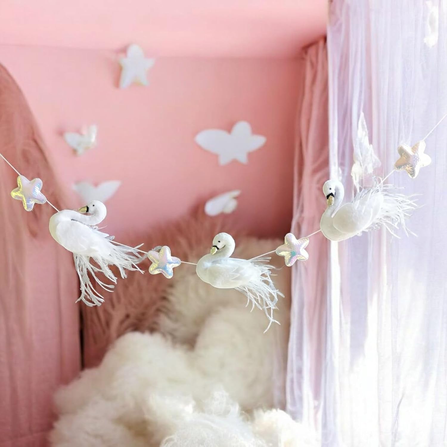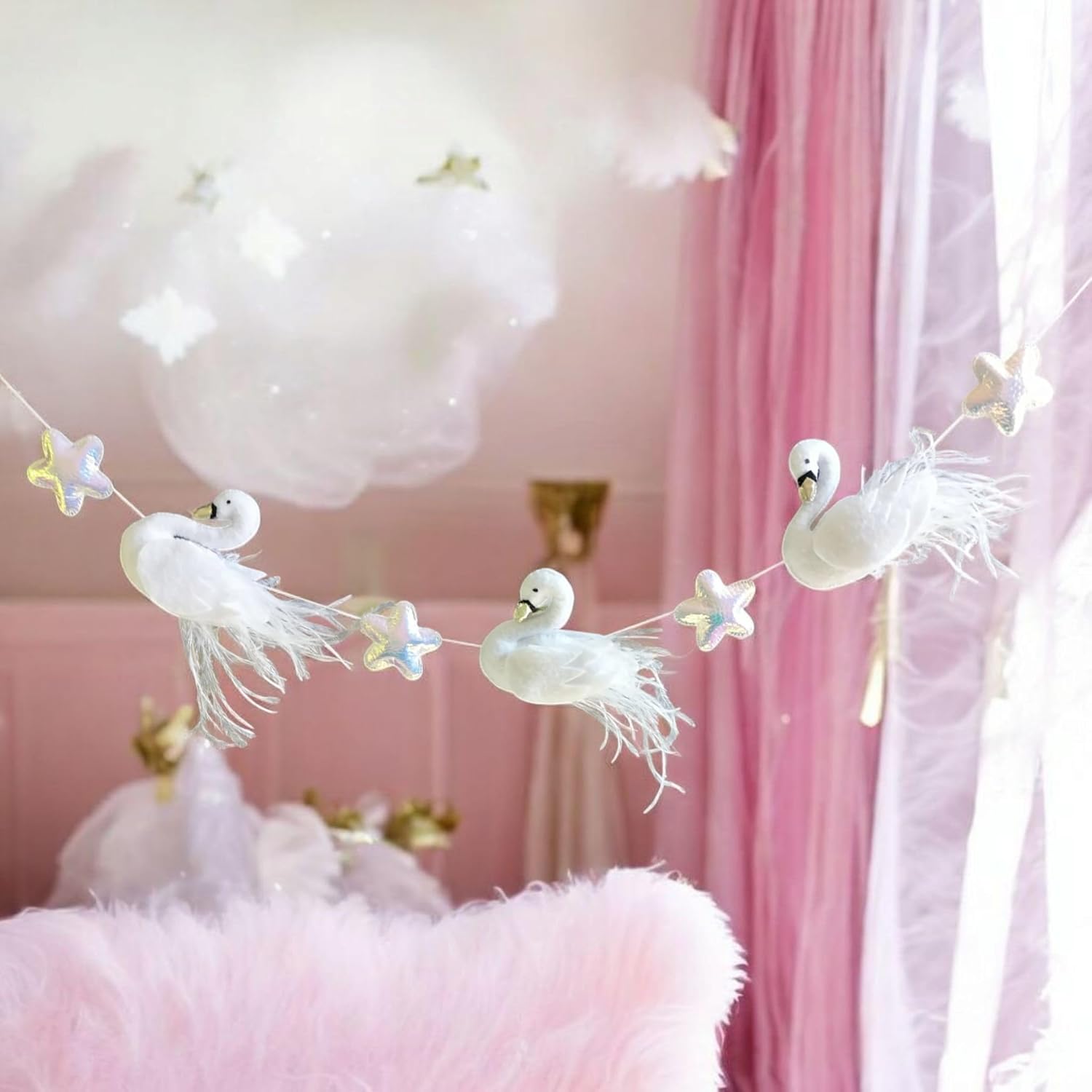 This delightful garland is a perfect way to bring color and charm to any nursery or babyâs room. Designed with vibrant rainbow hues and delicate shimmering accents, it adds a magical touch to your little one's space. The playful swan design and twinkling stars create a whimsical and inviting atmosphere, making it an ideal choice for a girlâs room or celebration.