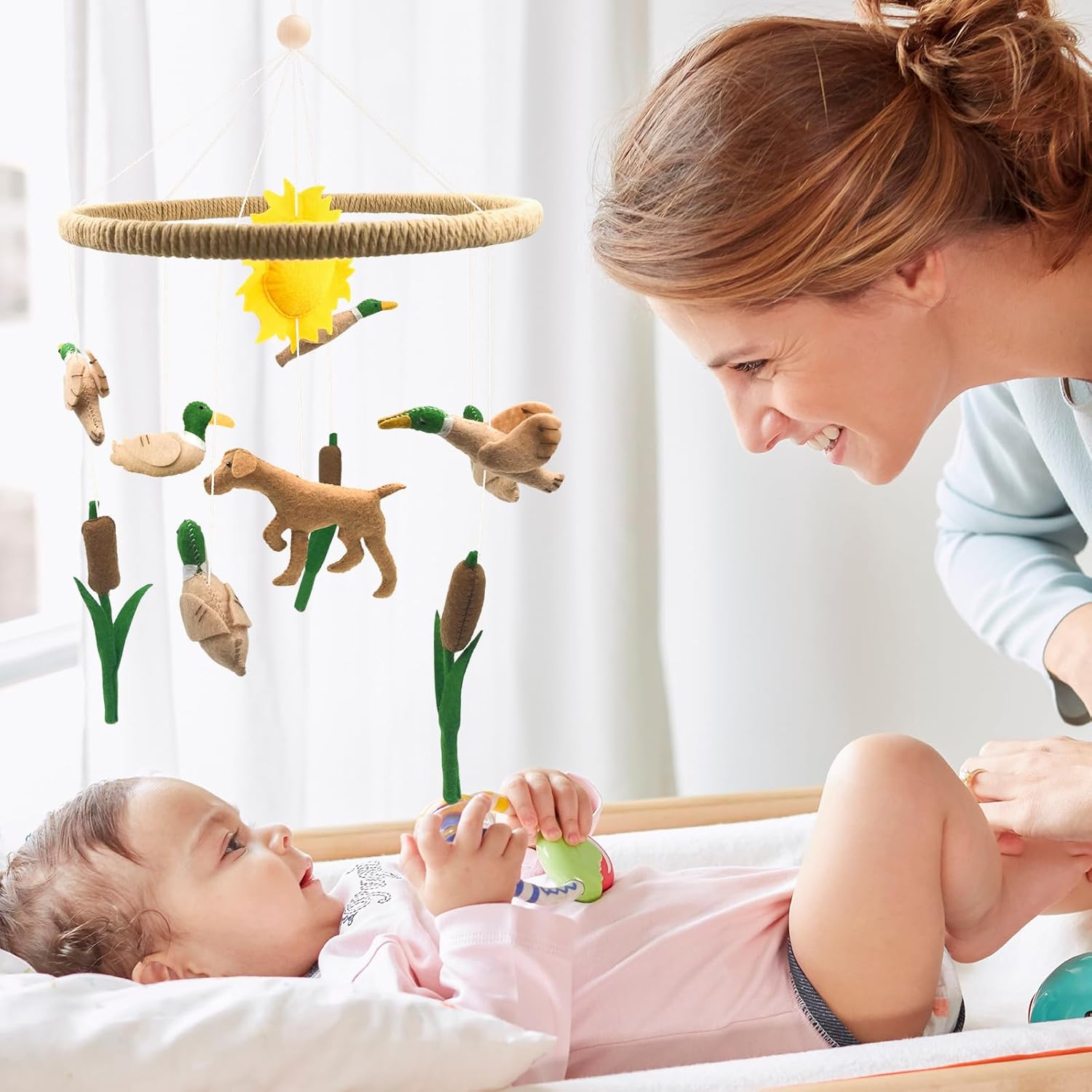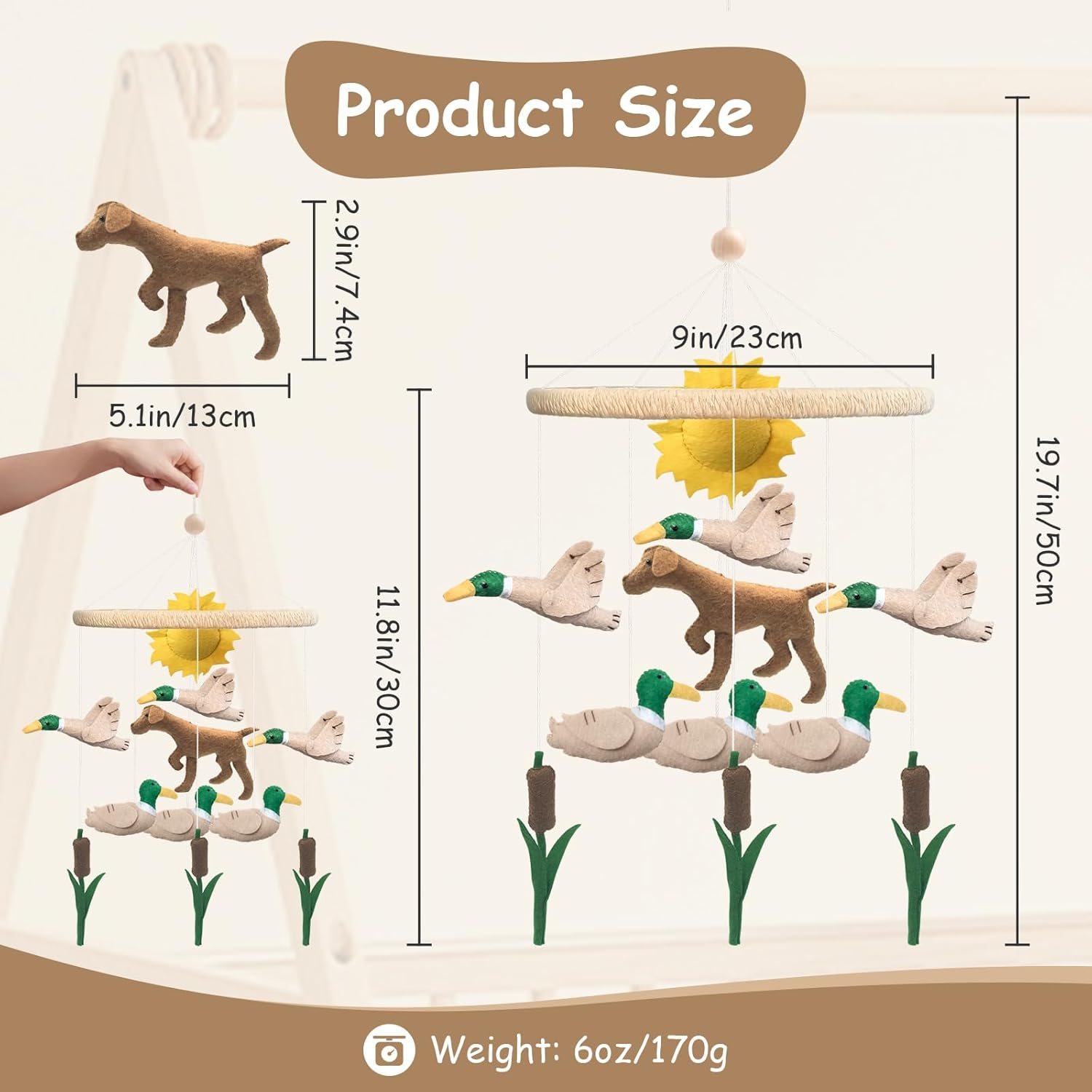 This Teeloray Duck Hunting Baby Crib Mobile is a beautifully crafted addition to any nursery, blending softness with charm. Its hand-painted mallard duck, playful dogs, and serene reeds offer a nature-inspired touch that captivates both parents and little ones. The 9-inch wooden top circle, wrapped in cotton thread, adds a rustic elegance to the design, making it a standout piece in your baby's room.