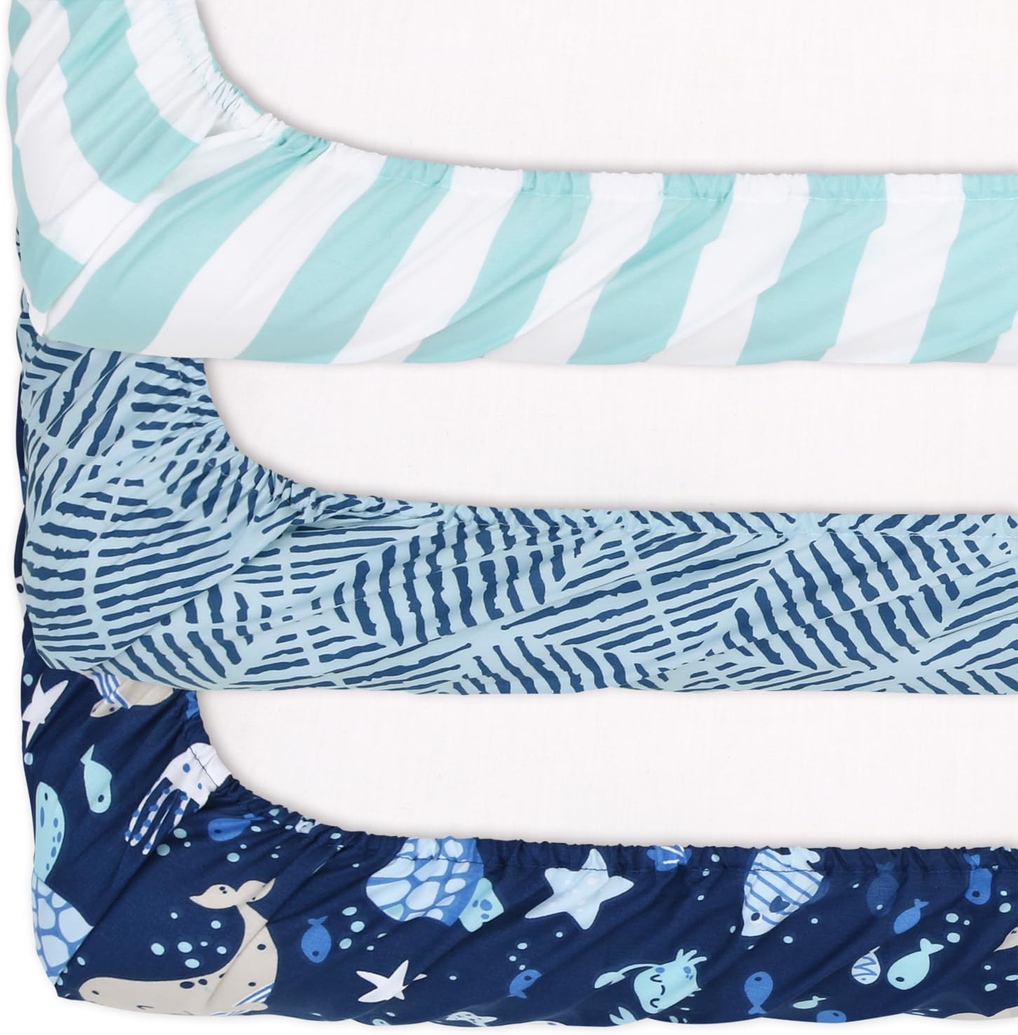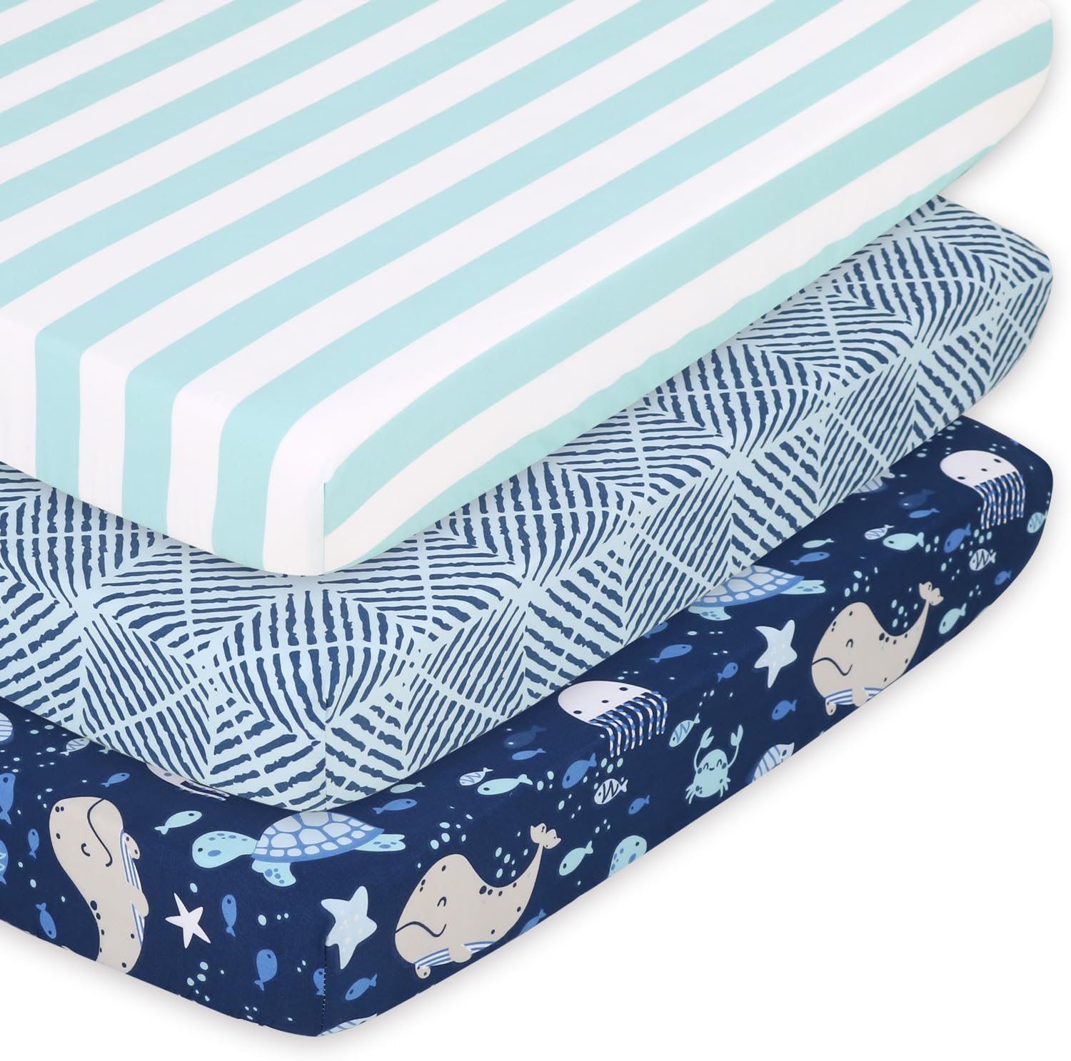 Create a cozy and imaginative space for your little one with these stylish playard sheets. Designed to blend comfort with creativity, they feature vibrant sealife-themed patterns including sea creatures, classic stripes, and geometric designs in shades of blue, navy, and aqua green. These sheets are more than just beddingâthey're a delightful addition to the nursery, helping transform sleep and play time into a magical underwater experience.