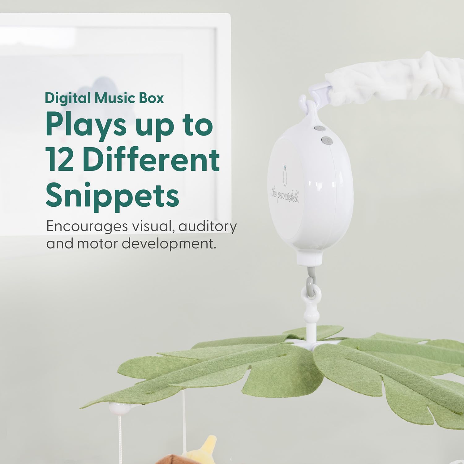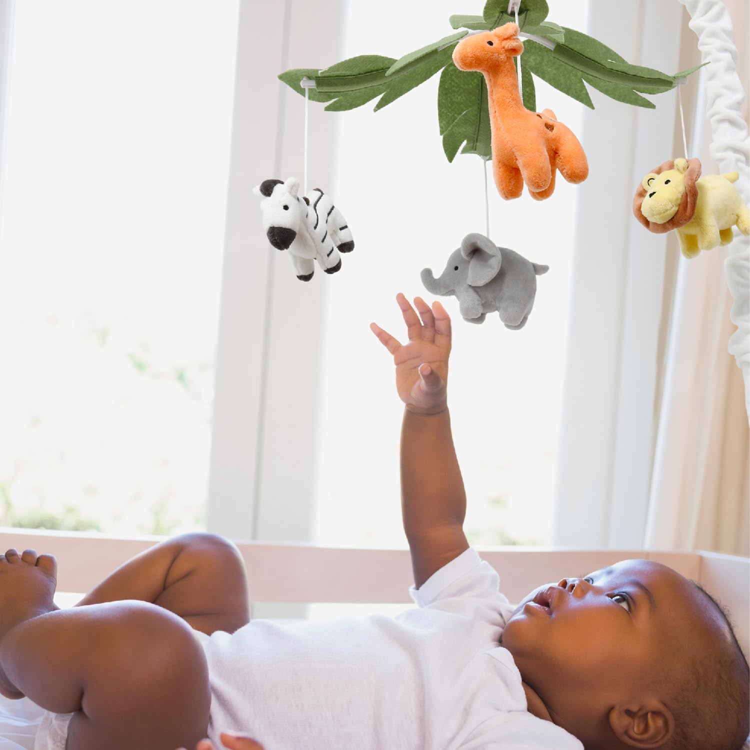 Add a touch of wonder to your babyâs sleep time with this enchanting musical crib mobile from The Peanutshell. Designed with a gentle rotating mechanism and a digital music box, it features 12 soothing lullabies that create a peaceful atmosphere for your little one to drift into dreamland. The playful jungle animal themeâelephant, giraffe, zebra, and lionâadds a delightful visual touch to your nursery while offering both auditory and visual stimulation. With easy one-click controls, you can adjust between music, rotation, or both, giving you full control over your babyâs bedtime experience.