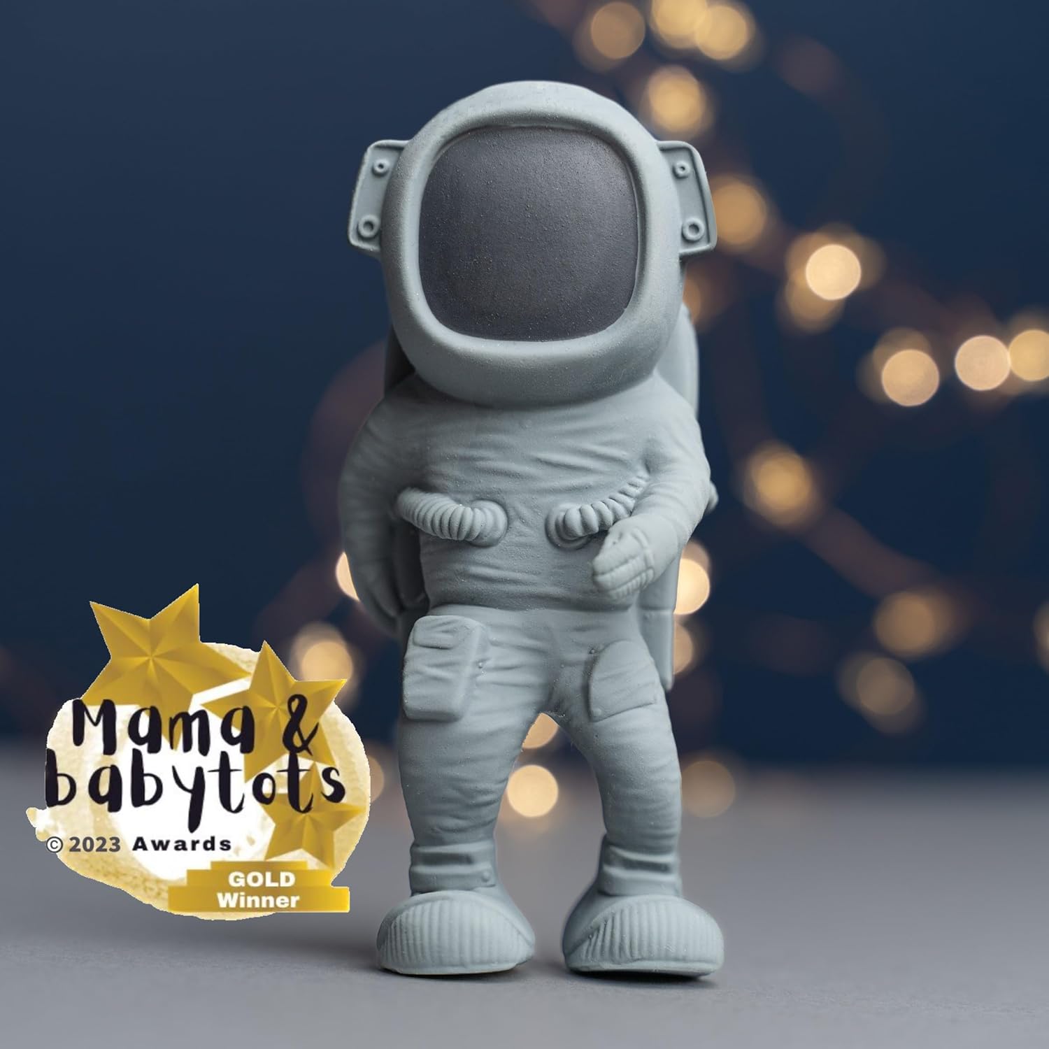 Introducing the Thumble AstroGNAW, a unique teething toy that brings playful exploration to your baby's daily routine. With its astronaut shape, featuring a sleek grey body and a bold black visor, it's designed to spark curiosity and imaginative play. Made from 100% natural rubber, it's free from PVC, BPA, phthalates, and nitrosamines, so you can feel safe knowing your baby is enjoying a hypoallergenic, durable chew toy. Each piece is handmade and infused with natural permanent pigments, making every AstroGNAW a one-of-a-kind treasure in your baby's toy collection.