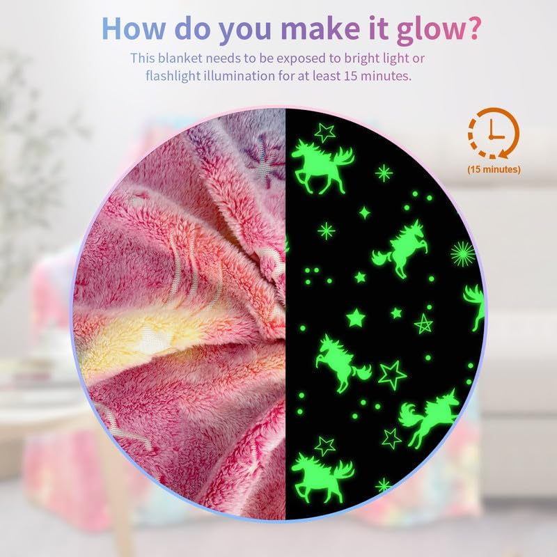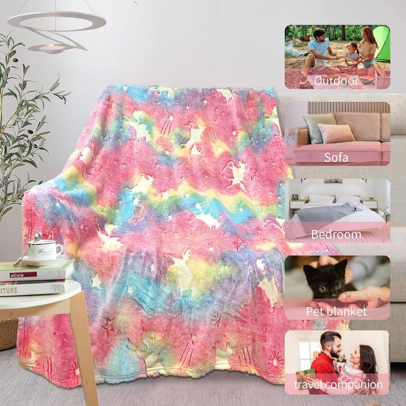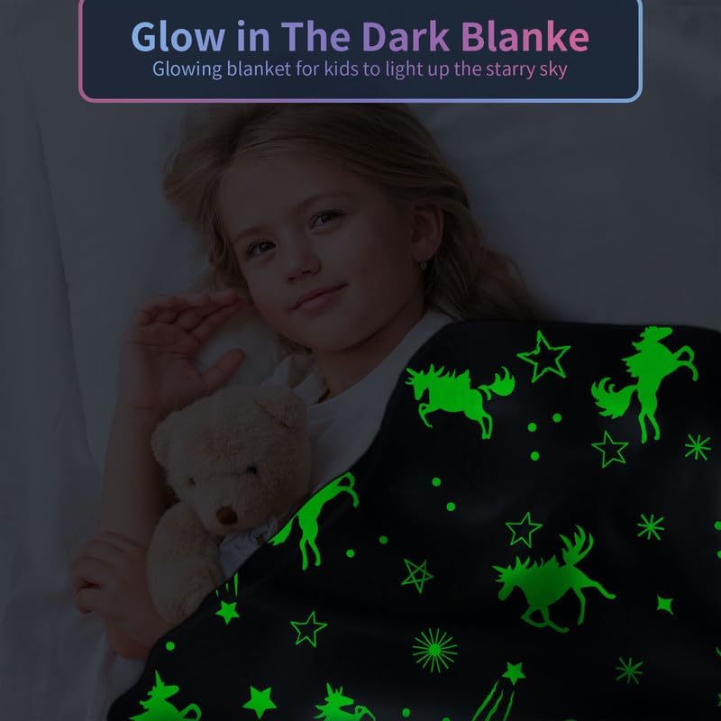 This enchanting glow in the dark unicorn blanket is more than just a cozy accessory; it's a magical way to bring wonder into your child's world. Crafted from ultra-soft plush fleece fabric, it offers all-day comfort and warmth without compromising on safety, making it ideal for sensitive skin. The glow in the dark design adds a touch of enchantment to bedtime, transforming your room into a fairy-tale setting every night. Designed with eco-friendly printing and dyeing technology, the blanket retains its vibrant colors and smooth texture for years, resisting fading and pilling. It's built to last, providing durable comfort that parents can trust. Whether you're looking for a unique gift or a charming addition to your child's space, this unicorn throw blanket for kids delivers both style and substance. With its versatile decor appeal, this blankety is perfect for any roomâbedrooms, nurseries, or living rooms. It blends practicality with playful magic, making it a magic blanket for girls that feels like a dream. Easy to clean and maintain, it's a great choice for busy families who want to keep the charm of their child's room intact, no matter the season.Glow in The Dark Unicorn Blanket â A Whimsical Haven for Kids