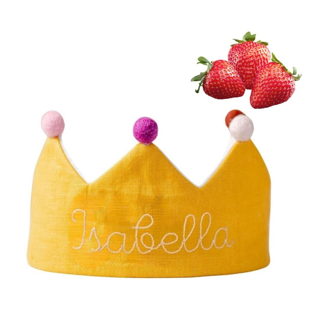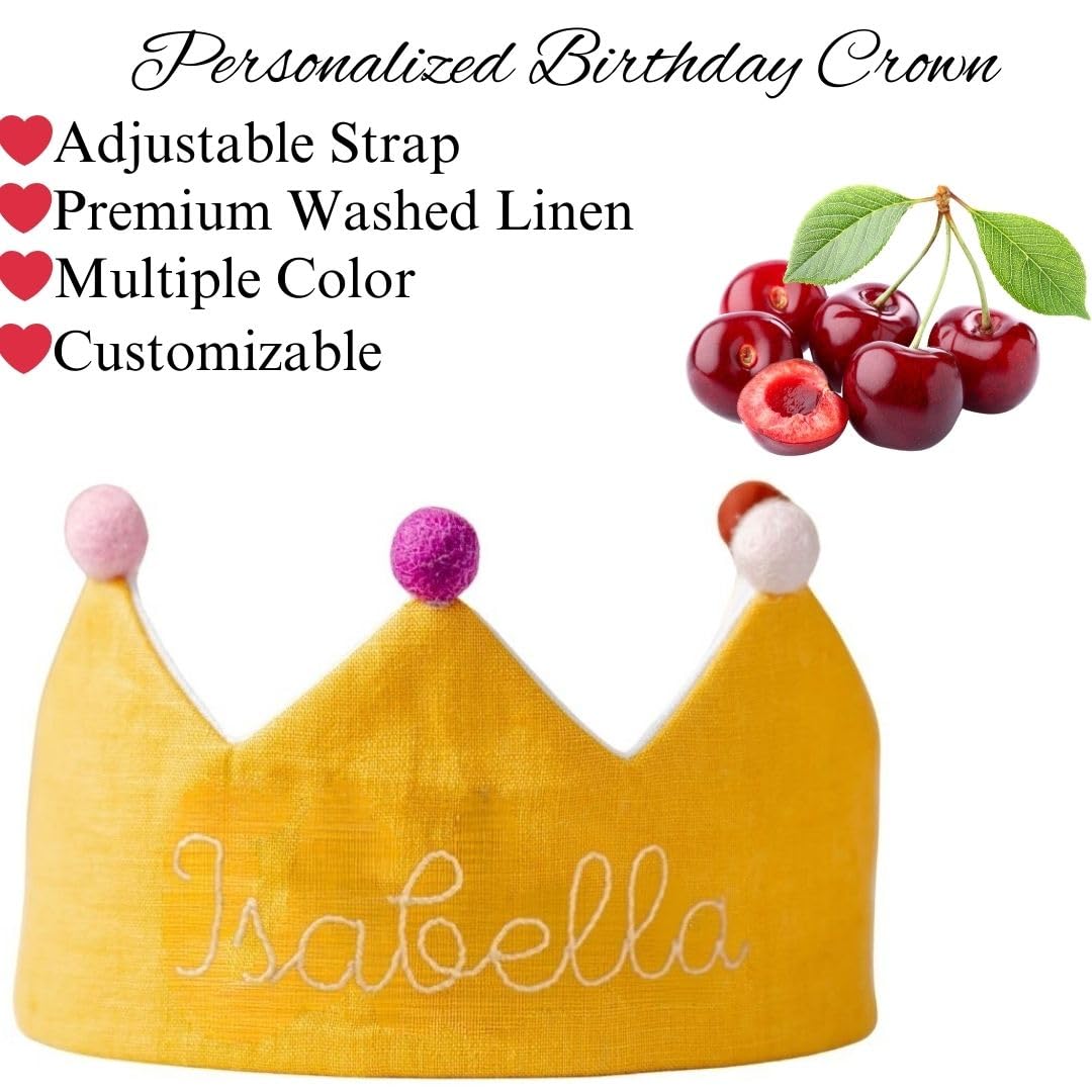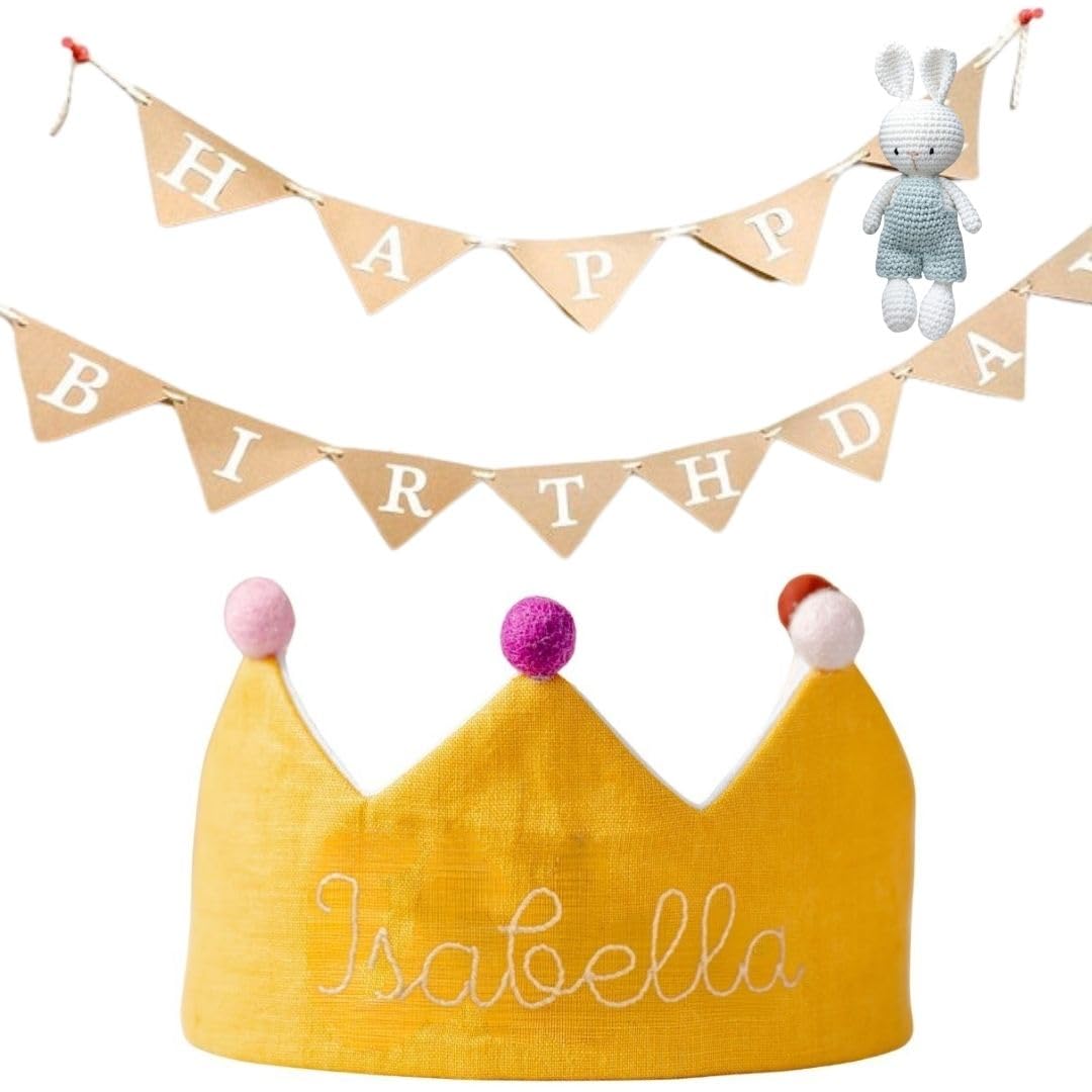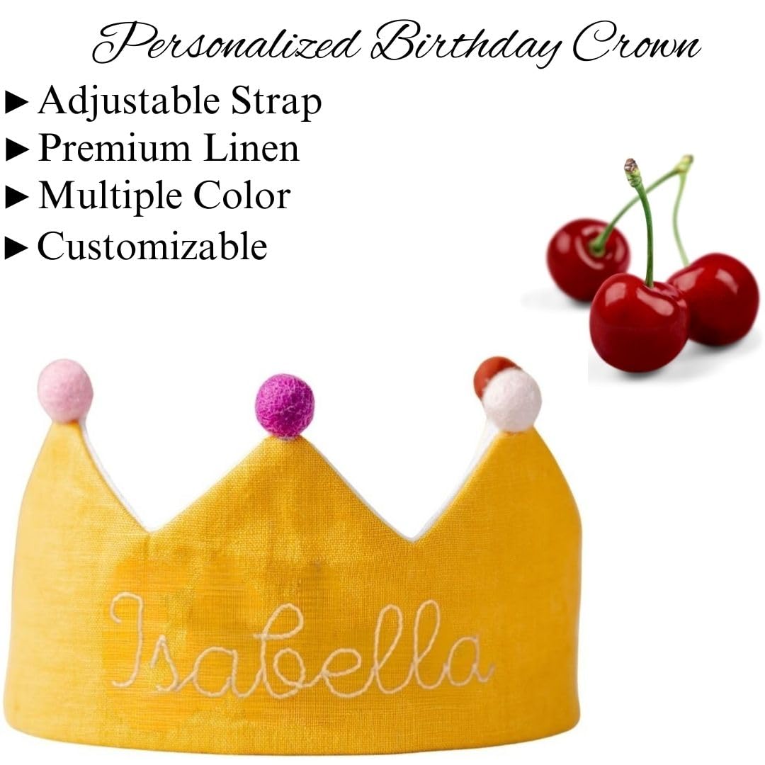 Designed with care, this baby party crown features an adjustable elastic band for a secure and customizable fit. The vibrant yellow color and embroidered name make it a standout accessory for birthdays or any festive occasion. Made with premium wash linen and wool pom poms, itâs both stylish and safe for young children. The custom cotton tie is gentle on the skin and built to last. A perfect gift from parents to children, this crown adds a touch of elegance and fun to every celebration.